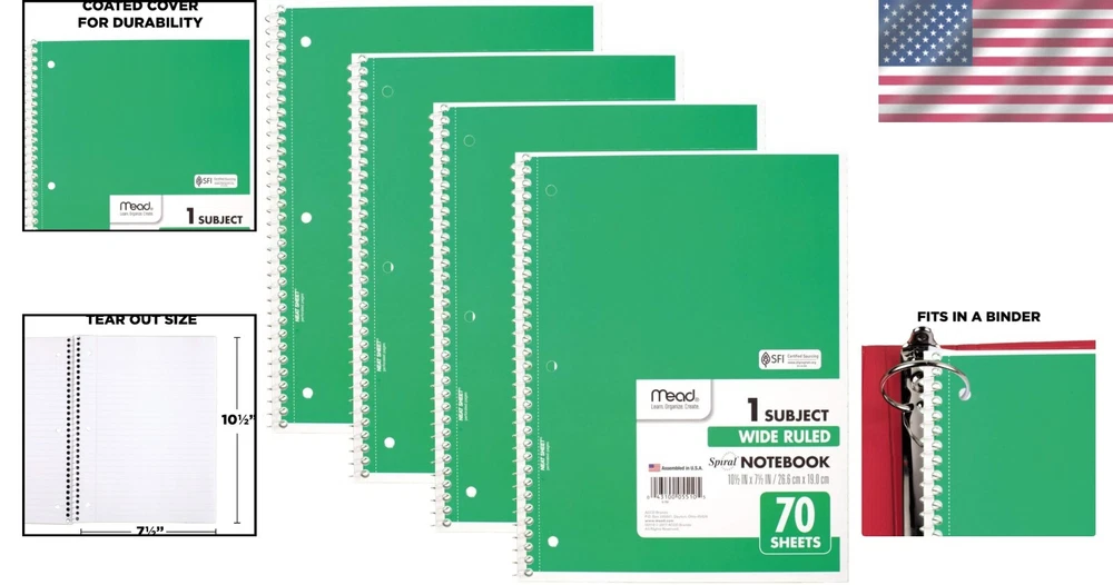 Perforated Wide Ruled Spiral Notebooks - Pack of 4, 10-1/2 x 7-1/2 Inches, Green ‹ › ‹ › ‹ › ‹ › ‹ › ‹ › ‹ › Perforated Wide Ruled Spiral Notebooks - Pack of 4 10-1/2 x 7-1/2 Inches, Green Features: 70 wide ruled, double-sided sheets for plenty of notetaking space Pages are perforated for easy tearing with clean edges 3-hole punched for storage in your favorite binder Spiral binding resists uncoiling and snagging Durable coated notebook covers Sheets measure 10-1/2" x 7-1/2" when torn out Pack includes 4 green notebooks Benefits: Versatile and ideal for a variety of uses including in-class assignments and homework Convenient size for carrying in a backpack or bag Perforated pages make it easy to share notes or keep organized 3-hole punched for easy storage and organization Durable construction for long-lasting use Includes multiple notebooks for all your notetaking needs Why choose our Perforated Wide Ruled Spiral Notebooks? Stay organized and prepared for any class or project with our Pack of 4 Perforated Wide Ruled Spiral Notebooks. With plenty of notetaking space, easy-to-tear pages, and durable construction, these notebooks are perfect for all your academic needs. The 3-hole punched design allows for easy storage in your favorite binder, keeping all your work in one place. Don't settle for flimsy notebooks that fall apart - choose our high-quality Perforated Wide Ruled Spiral Notebooks for all your notetaking needs! Shipping Free & Fast Shipping - We offer free shipping to most of the USA with a normal delivery time of 3-7 days. However, due to the current situation, additional delivery time (up to 3 weeks) may be required for some items. Alternative Carriers - We may use alternative carriers (e.g. USPS, FedEx, UPS, etc.) to ensure your package arrives safely and on time. Due to the use of multiple carriers, we are unable to provide a tracking number automatically. Handling Time - Orders are processed and shipped within 1-2 business days of receiving cleared payment. Shipping Restrictions - Shipping to Alaska, Hawaii, Puerto Rico, Guam, and other US territories may incur shipping charges or delivery restrictions. Please contact us before ordering, or your order can be refunded/cancelled. State Restrictions - There may be restrictions based on your state of purchase. For example, certain items may not be shipped to California due to state regulations. Contact for Tracking Updates - If you require tracking updates or have any concerns about the delivery of your order, please feel free to contact us, and we will be happy to assist you. Return 30-Day Hassle-Free Returns - We want you to be completely satisfied with your purchase. If you are not, you can return the item within 30 days of receiving it for a full refund or exchange. Easy Return Process - To start a return, simply contact us and we will provide you with a prepaid return shipping label and detailed instructions. Restocking Fee - There are no restocking fees for returns. However, the buyer is responsible for return shipping costs if the return is not due to a seller's error. Refund Processing Time - Refunds will be processed within 5 business days of receiving the returned item in its original condition. Payment We accept all major credit cards, PayPal, and Apple Pay for your convenience. Your payment information is secure and encrypted to ensure a safe and seamless transaction. Please complete your payment within 3 days of purchase to avoid any delays in shipping. Feedback Your feedback is extremely important to us. We strive to provide the best products and customer service possible. If you are satisfied with your purchase, please take a moment to leave us a positive review. If you have any concerns or issues with your order, please contact us before leaving negative feedback. We are committed to resolving any problems and ensuring your satisfaction. Contact Us If you have any questions or concerns, please feel free to reach out to our customer support team. You can contact us through the eBay messaging system. We are available Monday to Friday, 9:00 am to 5:00 pm EST, and we will do our best to respond to your inquiry within 24 hours. Thank you for supporting our small family business!