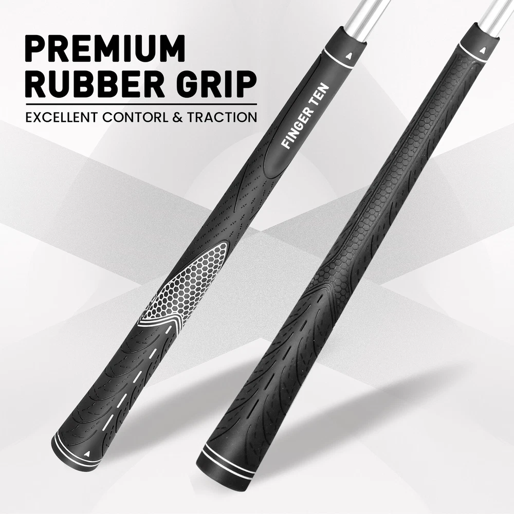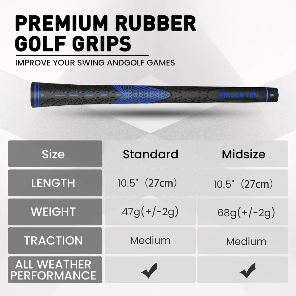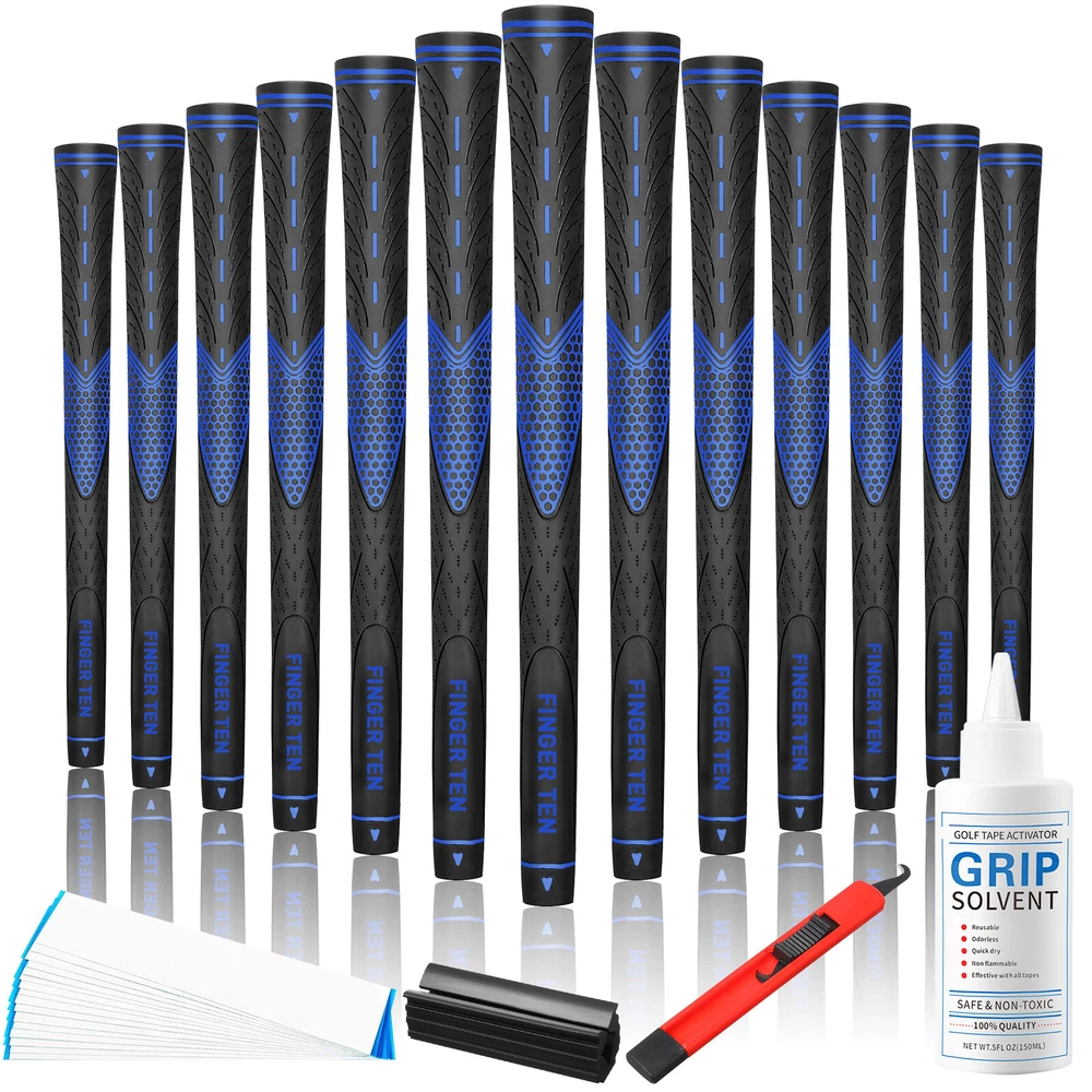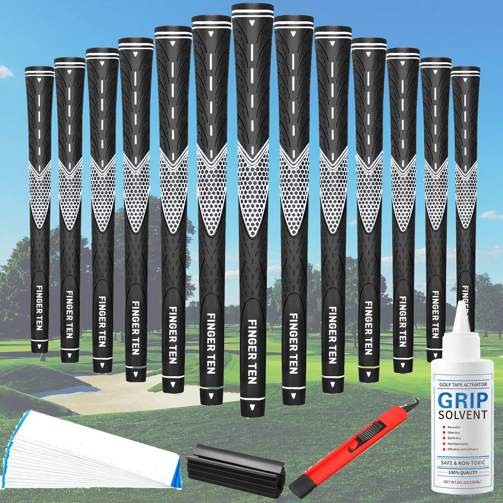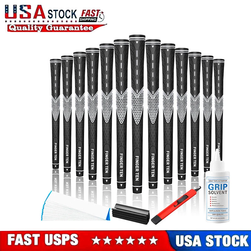 Package Includes : 13 * golf grips , 15* golf tapes ,1 * grip tape spray solution,1*rubber vise clamp,1* grip blade. Proprietary Rubber Material : Exclusive high-feedback rubber material used to providing precise ball feedback and comfortable feel all time. Texture Control : 3 kinds of micro texture used to improve traction & control and provide comfortable feel in any conditions. Taper Profile : Traditional taper profile encourages lighter grip pressure, promoting less tension in the hands and creating more fluidity and power throughout the swing. On Jan 11, 2025 at 21:06:31 PST, seller added the following information: