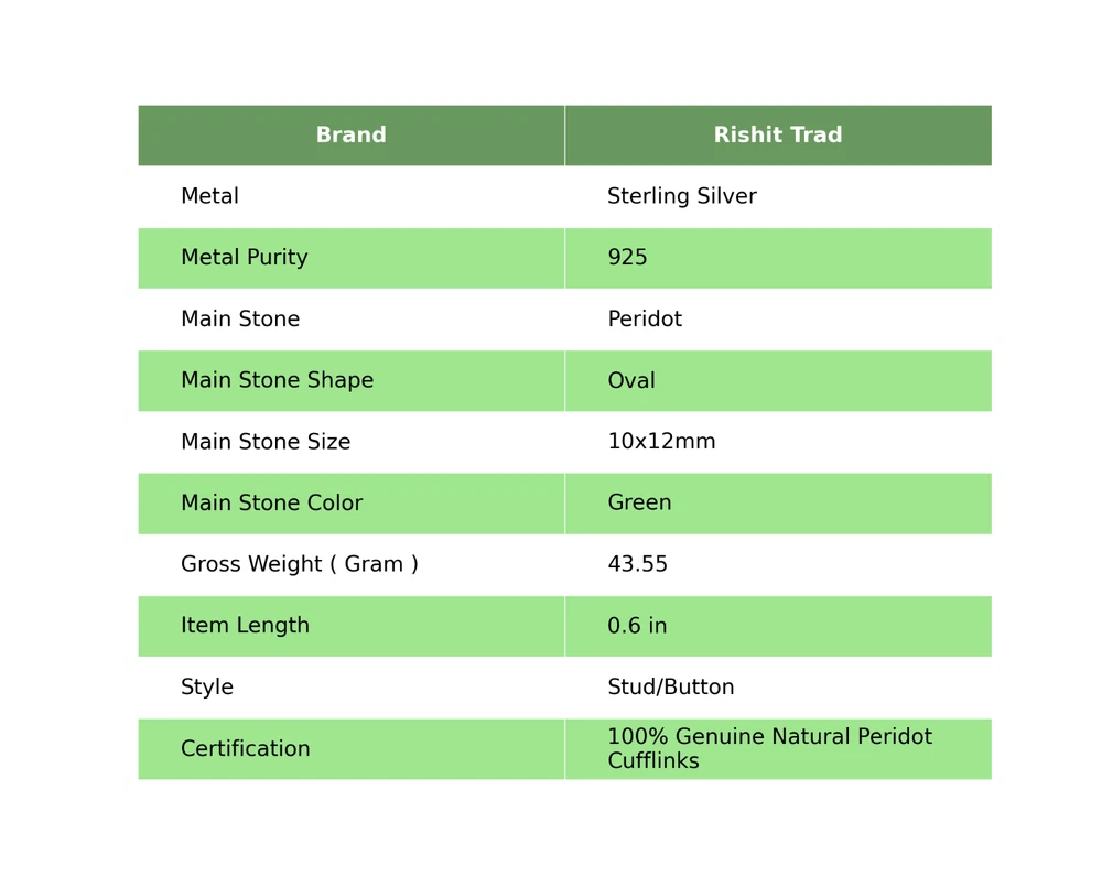 A perfect blend of classy and elegant design Cufflinks featuring 925 Sterling Silver with Peridot. This is must to provide you an eye-catching attention. ---------------------------------------------------- ------------ Welcome to Our Shop Rishittrad ---------------------------------------------------- ------------ Description:- SKU :- CL-1-12 Metal :- Sterling Silver Metal Purity :- 925 Gemstone :- Peridot Gemstone Color :- Green Gemstone Shape :- Oval Gemstone Origin :- Setting :- Channel-Set Cufflink Lenght : - 0.6 Inches ---------------------------------------------------- ------------ -------- ------------ Elegant Birthday Tribute:- Discover the essence of sophistication with our Birthday Radiance collection. Crafted with exquisite attention to detail, each piece embodies the timeless elegance and symbolic significance of birthdays. Craftsmanship Excellence:- Meticulously fashioned from premium 925 sterling silver, our jewelry pieces boast a classic and enduring design. The rich tones of natural gemstones complement the silver setting, creating a captivating harmony that resonates with wisdom and truth. Symbol of Personal Growth:- Gift with intention and meaning. Our Emblem of Wisdom pieces symbolize heartfelt wishes for personal growth and enlightenment on the recipient's special day, making it a cherished gesture of love and appreciation. Versatile Elegance:- Measuring at 1.2 inches, our creations seamlessly blend into any ensemble, offering both daily wearability and the ability to elevate sophisticated looks for special occasions. Their adaptable design ensures they become treasured additions to any jewelry collection. Thoughtful Expression of Love:- Surprise your beloved with a gift that transcends mere adornment. Our Natural Gemstone 925 Sterling Silver collection is a stylish and thoughtful token, exuding elegance and emotion while conveying warmest wishes with enduring grace. Exquisite Presentation:- Delight in the joy of gifting with our meticulously presented pieces, elegantly housed in an exquisite gift box. Make their birthday truly memorable by presenting them with a gift that captures the allure and timeless elegance of sterling silver. -------------------------- Image Policy----------------------------- All images are captured in natural lighting. The product showcased is the exact item you'll receive. -------------------------- Delivery Policy-------------------------- Standard Shipping typically takes 15-25 days, depending on your location. For expedited shipping, additional charges will apply. --------------------------- Product Policy--------------------------- You will receive the exact product depicted in the photos. All items are meticulously handcrafted. ------------------------------ Order Policy------------------------------ We welcome orders from around the globe. Custom orders are also accepted. Bulk orders are available upon request. Should you have any queries about our products, please don't hesitate to reach out. Upon receiving your product, we'd appreciate your feedback. ⋆⋆✦✧✦⋆⋆⋆⋆✦✧✦⋆⋆⋆⋆✦✧✦⋆⋆⋆⋆✦✧✦⋆⋆⋆⋆✦✧✦⋆⋆⋆⋆✦✧✦⋆⋆⋆⋆✦✧✦⋆⋆ "Discover a captivating collection of handcrafted gemstone jewelry at our boutique." https://www.ebay.com/str/rishittrad0 ♥ Thank you for choosing us ♥