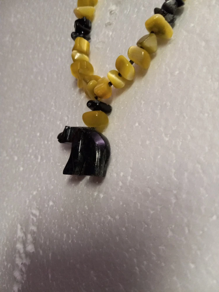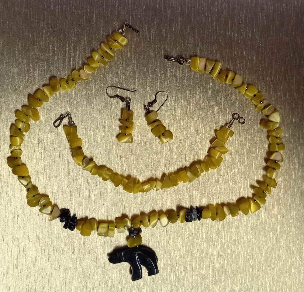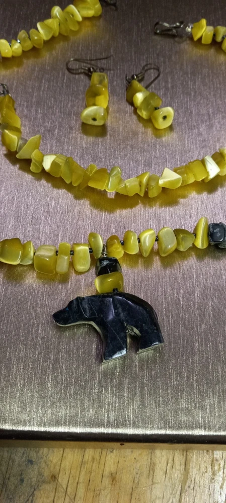 This Peridot Gemstone Bear Necklace Set features a charming design with polar bear-shaped main stones in a vibrant yellow color. The set includes earrings, a necklace, and a bracelet, all adorned with peridot gemstones. The main stone color and shape, as well as the overall theme of the set, create a unique and eye-catching jewelry ensemble perfect for adding a touch of whimsy to any outfit. Neaklace 17 inches Bracelet 6 inches Earrings 1.5 inches