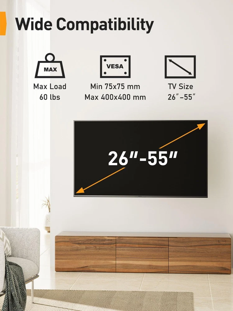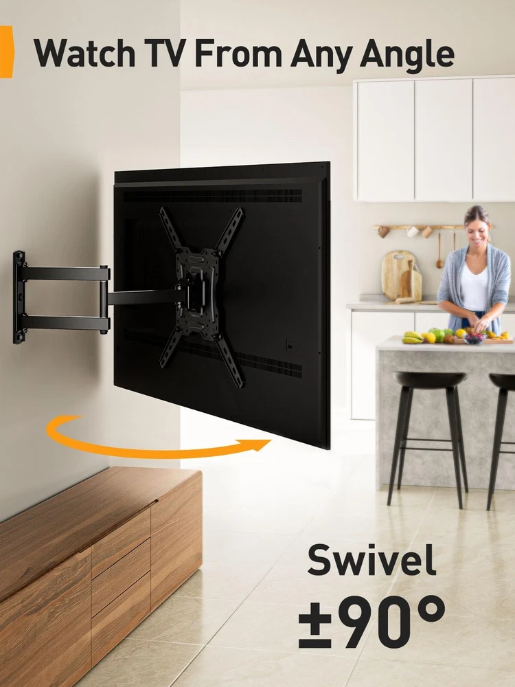 TV WAll Mount Compatibility: This tv mount fits most 26”-55” TVs with VESA patterns 75x75 to 400x400mm and weigh up to 60 lbs. Please verify the size, weight, and VESA mounting pattern of your TV before purchase wall mount tv brackets. Compatible with Samsung, Sony, Panasonic, Toshiba, Sharp, LG, Philips, JVC, and more other TV brands. Enjoy the Best View : The full motion tv mount features +90°/-90° swivel, +5°/-15° tilt, level the TV +/-3° after installation. Easily adjust the swivel tv wall mount to minimize screen glare for more comfort. Perfect for Corners & Space Saving: The single-stud design makes this tv mount the ideal solution for mounting your TV near a corner. The corner tv wall mount can extend out 18.9” from the wall and retract back to 2.0” for a low-profile look. It's perfect for smaller living rooms, kitchens, or rooms with non-standard wall stud spacing. Solid Steel Heavy Duty Construction: Crafted from sturdy cold-rolled steel, this tv mount 50 in has high standards. The 55 inch tv wall mount has stronger articulating arm and wider wall plate ensure that your TV will stay securely in place on the wall. Easy to Install: Mounting the mount for TV is as easy as 1-2-3. Step-by-step instructions and mounting hardware are included for hassle-free installation. Post-installation leveling allows you to fine-tune your TV’s position by +/-3° after mounting.