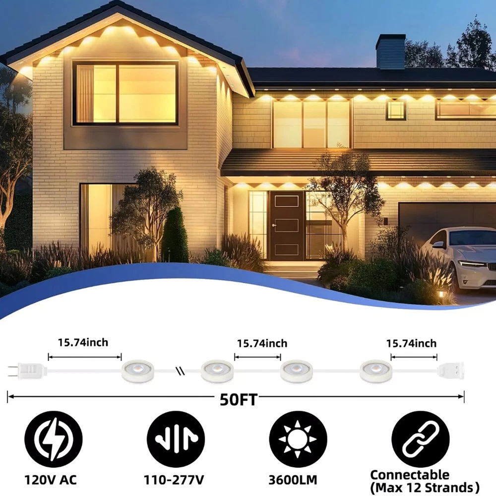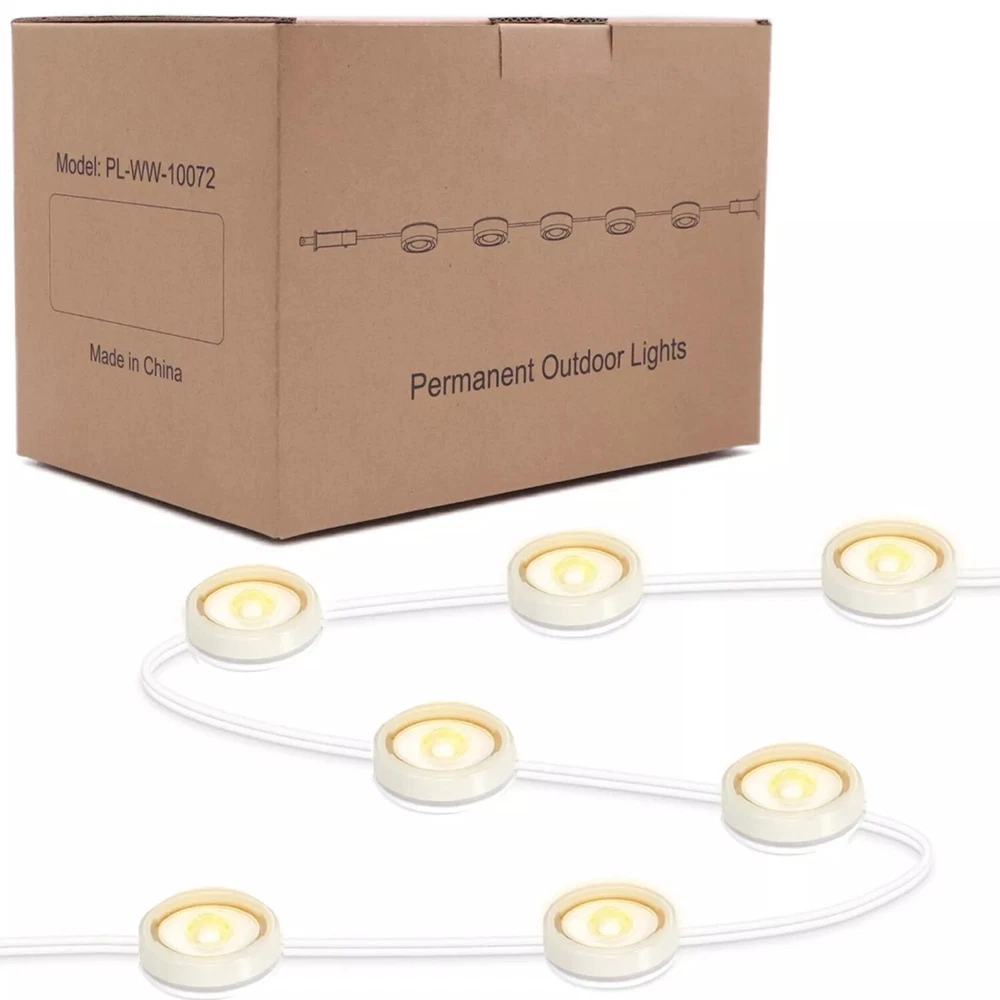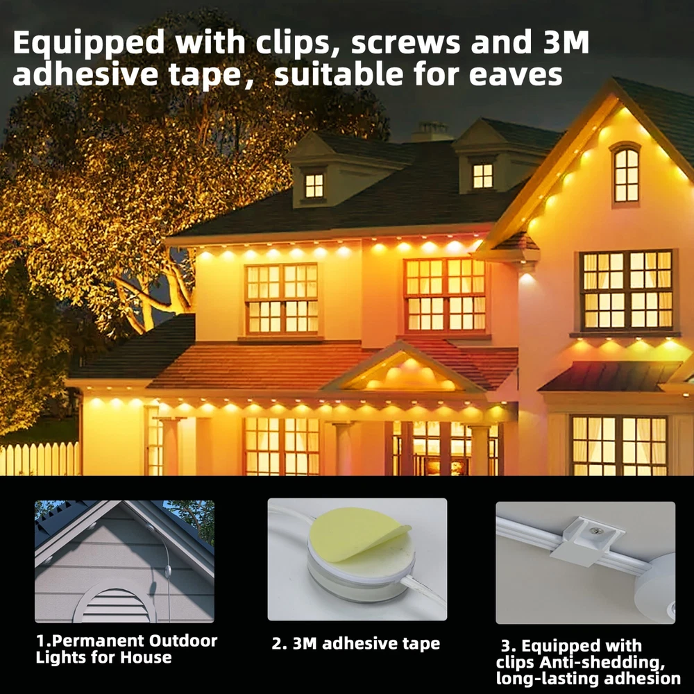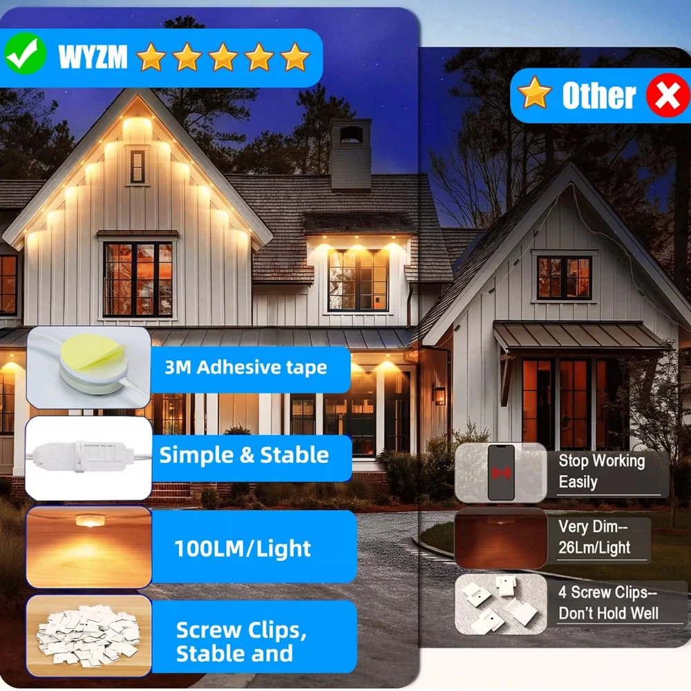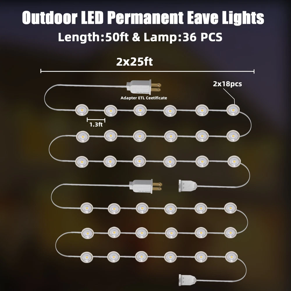 Permanent Outdoor Lights,100FT with 72 LED Lighting,Eaves Light for Daily,Garden Please Note: 100FT with 72 LEDs = 2 Pack 50FT 36 Lights Same day send from GA warehouse. More than 200pcs stock in local warehouse,welcome to ask best price for bulks,thanks. Our LED Eaves Lights provide 2700K light to perfectly match your home's exterior lighting. Elevate Your Festive Ambiance featuring an anti-glare lens for a stunning arc-shaped light effect. All-in-One Kit - Two 25 ft. white strands, total 50 ft., 36 LEDs. There is 3M adhesive tape on the back of each light and we also give you some clips, which you can use to fix the string of lights to make the string of lights hanging on the eaves more sturdy. Highlights Illumination angle of a single lamp bead is 90° and it presents a unique arc-shaped light effect Simple installation, use the included 3M adhesive to attach the lights on the wall or eaves, secure wires with clips Our lights are IP65 waterproof and have a lifespan of 50,000-hours, suitable for any can environments ranging from minus 20 to plus 40°C Our lights are ETL certified for safety and reliability 2-year warranty Details Actual Color Temperature (K) 2700 Bulb Color White Bulb Shape Elliptical Color Rendering Index (CRI) 90 Color Temperature Warm White Dimmable Capability Non Dimmable Durability Shatter Resistant, Waterproof, Weather Resistant Exterior Lighting Product Type String Light Fixture Color/Finish Warm White Indoor/Outdoor Outdoor Light Bulb Type Included Integrated LED Lighted Length (ft.) 50 ft 【Transform Your Outdoor Ambiance】: Each 50FT outdoor permanent lights boast 36 warm white LED sources, each shining at 120lm/w—nearly three times brighter than standard eave lights. With a color temperature of 2700K, neither too yellow to make the scene old-fashioned nor too white to ruin the mood, these lights offer a perfect balance for daily and accent lighting, creating a cozy atmosphere ideal for family gatherings or festive celebrations that will leave a lasting impression on your guests. 【Reliable Addition to Any Outdoor Environment】: These year-round outdoor lights undergo rigorous testing to withstand extreme temperatures from -4℉ to 140℉ (-15℃ to 60℃). Designed to thrive in diverse climates, these forever outdoor lights are built with UV-resistant materials and an IP65 waterproof rating. Amazing Permanent Lights for Outdoor and Indoor Under Eave Lights Crafted with great sealed waterproof technology, this all-weather soffit decorative light is designed to withstand the elements, ensuring safe outdoor use throughout the year. Indoor Decorative Lights These string lights are standout decorative accent suitable for enhancing indoor spaces with beautiful wall washing lights 【Install Once, Enjoy Forever】: Each light is equipped with pre-assembled high-strength adhesive tape and cable screw clips for secure installation. The glued permanent Christmas lights can easily support their weight and withstand pulling forces up to 15lb, eliminating the need for frequent adjustments. Bid farewell to the hassle of climbing the ladder repeatedly to re-attach lights and spend more time enjoying the ambiance. 【Captivating Lighting Effects, Versatile Applications】: With a 90°beam angle and large wall-washing depth, each light creates a stunning illumination, akin to adding a yellow gemstone necklace to your house. You could customize the brightness by pairing the permanent lights with dimmers (not included). 【Worry-free to Get】: If you encounter any problems, please feel free to ask us for help.WZYM is always committed to offering premium products to our consumers and we highly value the advise of consumers. Warm Tips: The light string is not cuttable. What's in the box 50FT Permanent Outdoor Lights (36 Lights/String) x2 TS-24/TS-25 US standard plug x2 User Manual x 2