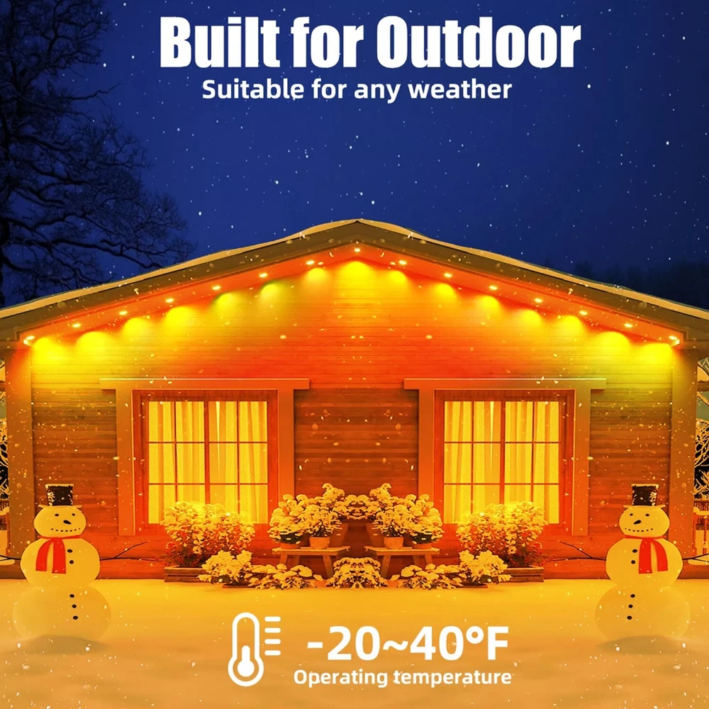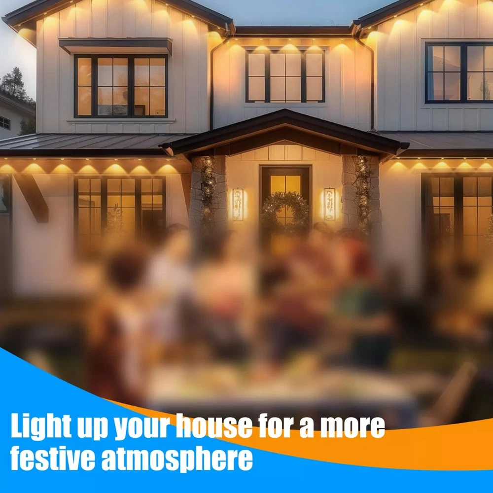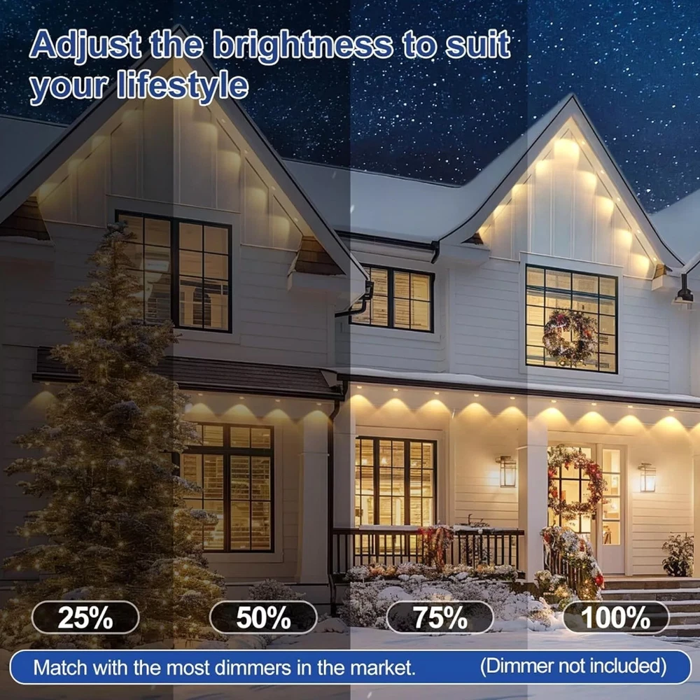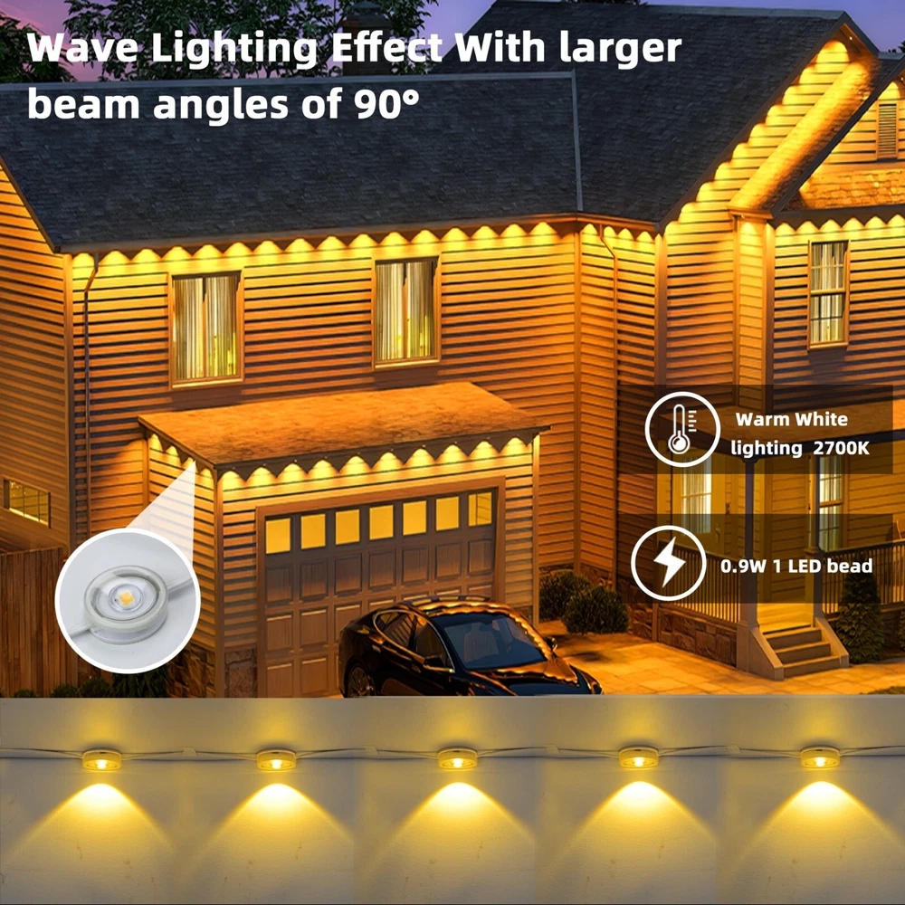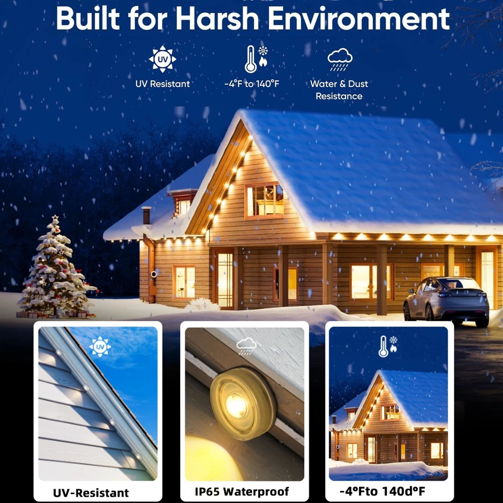 Permanent Outdoor Lights,100FT with 72 LED Lighting,Eaves Light for Daily,Garden Please Note: 100FT with 72 LEDs = 2 Pack 50FT 36 Lights Same day send from GA warehouse. More than 200pcs stock in local warehouse,welcome to ask best price for bulks,thanks. Our LED Eaves Lights provide 2700K light to perfectly match your home's exterior lighting. Elevate Your Festive Ambiance featuring an anti-glare lens for a stunning arc-shaped light effect. All-in-One Kit - Two 25 ft. white strands, total 50 ft., 36 LEDs. There is 3M adhesive tape on the back of each light and we also give you some clips, which you can use to fix the string of lights to make the string of lights hanging on the eaves more sturdy. Highlights Illumination angle of a single lamp bead is 90° and it presents a unique arc-shaped light effect Simple installation, use the included 3M adhesive to attach the lights on the wall or eaves, secure wires with clips Our lights are IP65 waterproof and have a lifespan of 50,000-hours, suitable for any can environments ranging from minus 20 to plus 40°C Our lights are ETL certified for safety and reliability 2-year warranty Details Actual Color Temperature (K) 2700 Bulb Color White Bulb Shape Elliptical Color Rendering Index (CRI) 90 Color Temperature Warm White Dimmable Capability Non Dimmable Durability Shatter Resistant, Waterproof, Weather Resistant Exterior Lighting Product Type String Light Fixture Color/Finish Warm White Indoor/Outdoor Outdoor Light Bulb Type Included Integrated LED Lighted Length (ft.) 50 ft 【Transform Your Outdoor Ambiance】: Each 50FT outdoor permanent lights boast 36 warm white LED sources, each shining at 120lm/w—nearly three times brighter than standard eave lights. With a color temperature of 2700K, neither too yellow to make the scene old-fashioned nor too white to ruin the mood, these lights offer a perfect balance for daily and accent lighting, creating a cozy atmosphere ideal for family gatherings or festive celebrations that will leave a lasting impression on your guests. 【Reliable Addition to Any Outdoor Environment】: These year-round outdoor lights undergo rigorous testing to withstand extreme temperatures from -4℉ to 140℉ (-15℃ to 60℃). Designed to thrive in diverse climates, these forever outdoor lights are built with UV-resistant materials and an IP65 waterproof rating. Amazing Permanent Lights for Outdoor and Indoor Under Eave Lights Crafted with great sealed waterproof technology, this all-weather soffit decorative light is designed to withstand the elements, ensuring safe outdoor use throughout the year. Indoor Decorative Lights These string lights are standout decorative accent suitable for enhancing indoor spaces with beautiful wall washing lights 【Install Once, Enjoy Forever】: Each light is equipped with pre-assembled high-strength adhesive tape and cable screw clips for secure installation. The glued permanent Christmas lights can easily support their weight and withstand pulling forces up to 15lb, eliminating the need for frequent adjustments. Bid farewell to the hassle of climbing the ladder repeatedly to re-attach lights and spend more time enjoying the ambiance. 【Captivating Lighting Effects, Versatile Applications】: With a 90°beam angle and large wall-washing depth, each light creates a stunning illumination, akin to adding a yellow gemstone necklace to your house. You could customize the brightness by pairing the permanent lights with dimmers (not included). 【Worry-free to Get】: If you encounter any problems, please feel free to ask us for help.WZYM is always committed to offering premium products to our consumers and we highly value the advise of consumers. Warm Tips: The light string is not cuttable. What's in the box 50FT Permanent Outdoor Lights (36 Lights/String) x2 TS-24/TS-25 US standard plug x2 User Manual x 2