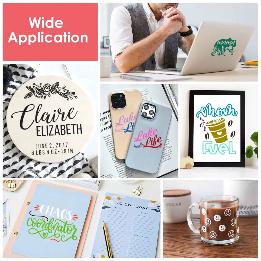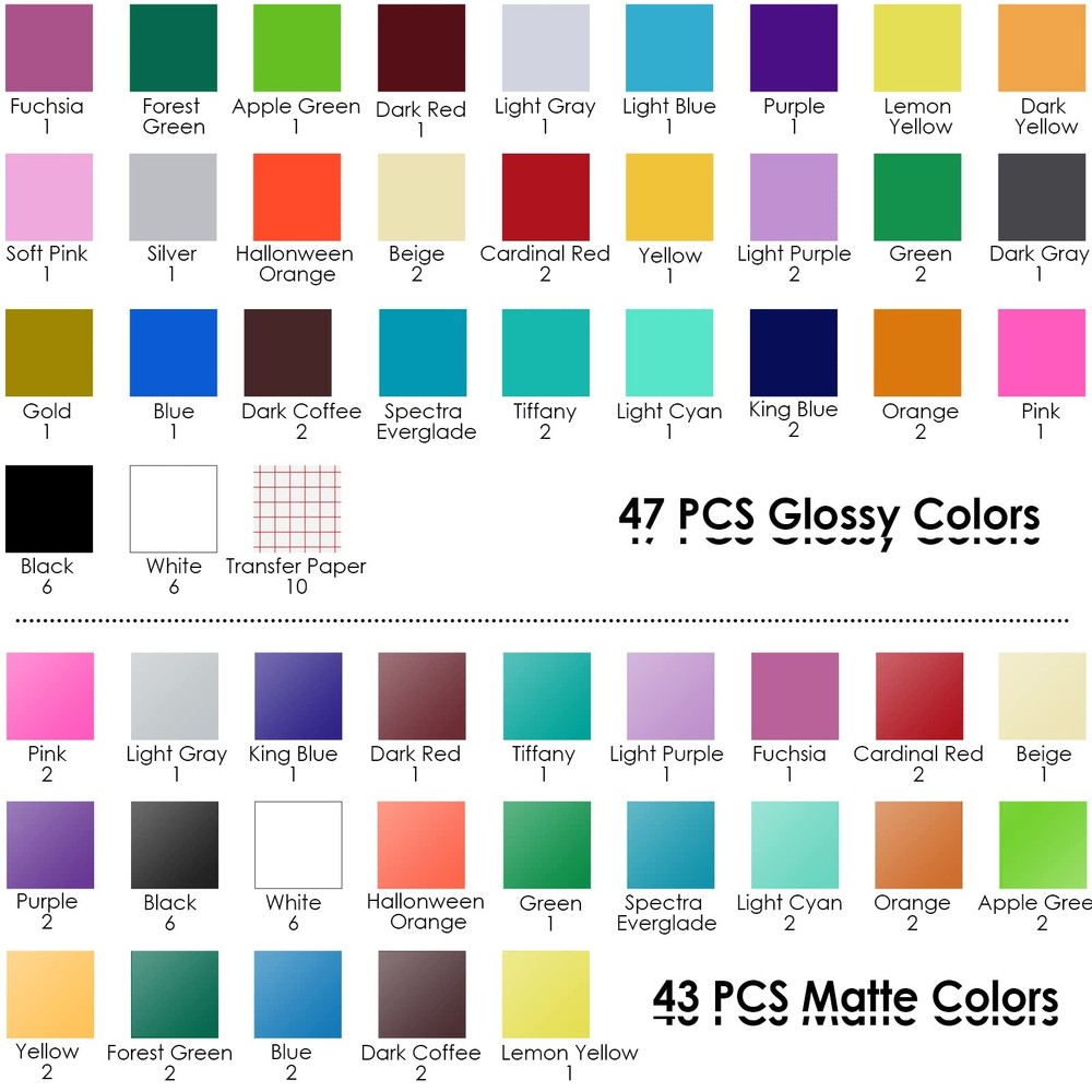 Choose permanent Vinyl sheets that you don't have to sacrifice quality for! Permanent Vinyl is an easy and flexible way to decorate your daily necessities, which can be typically used to create wall and window decals and business signage. It's durable and can also be waterproof which makes it very versatile. -Used on wall, car, wood, cup etc. -Indoor and outdoor use -Perfect for decorating and signing Why Choose permanent vinyl for cricut machine? -Easy to Cut, Weed and Transfer -Clear PET Backing -Great Stickiness and Durability -No Bubbles and Crease -Anti-Wind, Rain and Sun -Free Scraper Steps for Usage: 1. Create your design on computer. 2. Cut. For Cricut---Blade: Standard, Setting: Vinyl For Silhouette---Blade: 1, Force: 6, Speed: 5, Passes: 2, Material: Vinyl Smooth 3. Weed the excessive adhesive vinyl. 4. Use transfer tape to transfer. 5. Apply the design on your items and rub. 6. Peel the carrier. Customer Service Our brand value every customers'feeling and shopping experience. If you meet any problems when using our adhesive vinyl for crciut machine, please feel free to contact us. We will provide you the best solutions. Our 100 pack permanent vinyl bundle can be used on metal, glass, plastic, wood, ceramic, etc. You can use these permanent adhesive vinyl sheets on your cups, phone case, notebook or other craft projects. THIS IS PERMANENT VINYL NOT HTV,NO NEED HEAT TRANSFER !!! Package Include: This permanent vinyl bundle includes 90 permanent vinyl sheets, 10 transfer tape for vinyl, and 1 free squeegee. This permanent adhesive vinyl set has 47 glossy vinyl sheets and 43 matte vinyl sheets which size is 12 inches x 12 inches. Total 52 different colors. A nice choice for you to run your business or do some big projects Clear PET Backing: Compared to a paper backing, PET backing has a higher quality which can help you save time and money. You don't need to go through the frustrating using process. You can easily peel the adhesive vinyl sheets from the cutting board Easy to Use: Nice material can make cutting and weed so easy. The great stickiness also makes our vinyl can be used indoors and outdoors. You don't need to worry about our craft adhesive vinyl fade after rain or sun. Also, the transfer tape can be repeated use Wide Application: Adhesive vinyl can be used on any smooth and hard surface such as glass, plastic, metal, ceramic, wood, and so on. It's a great choice for you to decorate your mug, phone, notebook, bottle, etc. Notice we don't recommend using permanent vinyl for clothes or fabrics and cars Great Service: permanent vinyl has high quality and cheap price. We have confidence in our outdoor vinyl . If you have any issue with our vinyl permanent adhesive please feel free to contact us, we have a customer service team to help