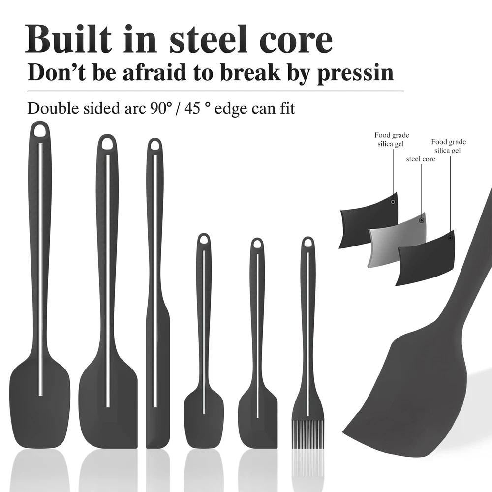 [ Quality] 100% made of food grade silicone rubber spatula set.Contains high-quality steel small metal spatula, strong and durable. tasteless kitchen safe. Smooth and flexible thin edge, no scratches, will not damage your pots and pans . [Seamless One-Piece Design] With easy-to-clean seamless one-piece design compact and sturdy, smooth surface cooking utensils for nonstick cookware, soft textured silicone grip better grip, than silicone spatula removable head more durable, hand wash or dishwasher.perfect for baking, cooking and mix etc. [Heat Resistant Utensils] Turn up the heat in your kitchen! with a solid stainless steel core and wrapped in kitchen silicone scraper that is heat-resistant up to 600° safe for nonstick spatulas for nonstick cookware. No melting, no warping, no worries! Quality Life. [Variety Pack] Our silicone cooking utensils set is versatile utensils ,Each package includes 1 jar spatula silicone long handle , 1 grill spatula brush,1 Large Spoon Spatula, 1 Small Spoon Spatula, 1 Large Spatula, and 1 Small Spatula.Versatile enough for use in frying pans, mixing bowls, sauce pots, grill, bottles, and more. [Permanent Warranty Service ] Our team will provide the longest after-sales service, If you have any questions about your silicone spatula set, you are ensured for "PERMANENT WARRANTY, GUARANTEED" without any questions asked.So you can enjoy your purchase with confidence knowing our service lasts forever.