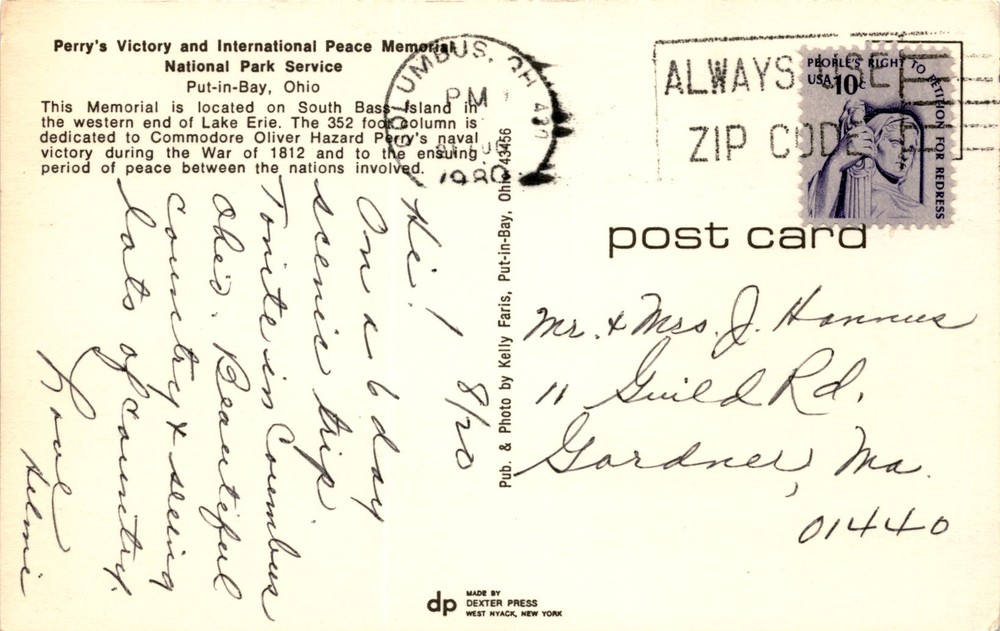 MAKE AN OFFER. THE MORE YOU BUY THE BETTER DEAL I WILL ACCEPT The postcard features an image of Perry's Victory and International Peace Memorial, located on South Bass Island in Lake Erie, Ohio. The memorial is a 352-foot column dedicated to Commodore Oliver Hazard Perry's naval victory during the War of 1812 and the subsequent period of peace among the nations involved.