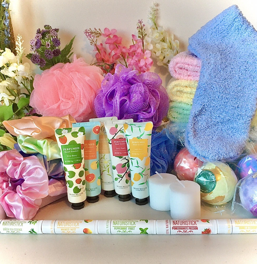 Personal Care and Beauty Bundle Bath and Relax Variety Spa Kit. This is a great gift to treat others or yourself to! Each pack has a Super Soft pair of Fuzzy socks, a Silky Smooth Hair Scrunchy, a Fluffy Bath Loofah, Creamy Smell Good Lotion, Long lasting Lip Balm, 3 small Relaxing unscented candles, and a Fizzy Bath Bomb! Each pack is different as scents and colors vary!