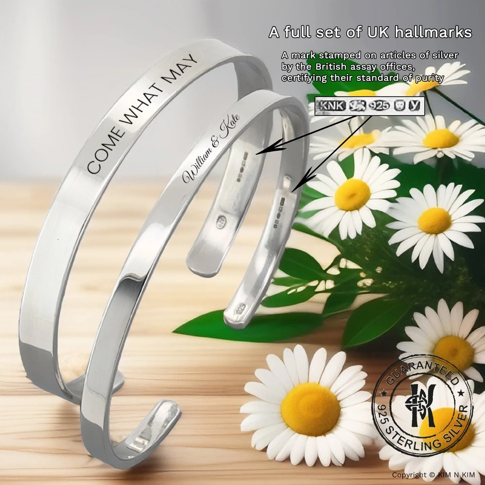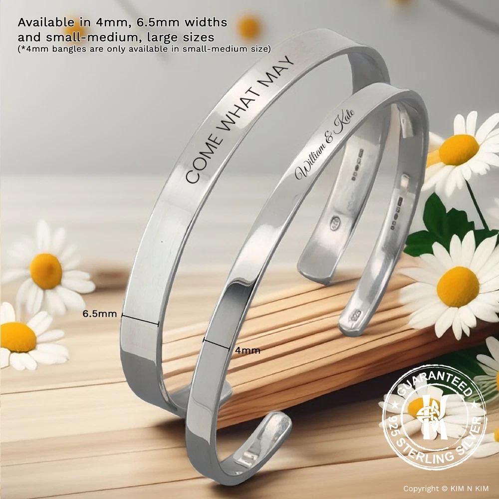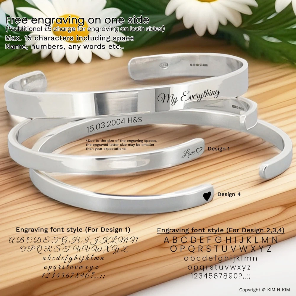 Personalised Bracelet Women✔️Love bracelet ✔️Womens bracelet✔️Heart bracelet This product data sheet is originally written in English. Kim n Kim Jewellery are suppliers of quality handcrafted 925 sterling silver jewellery. Our unique collection is an exciting blend of handmade classic, contemporary and designer silver jewellery at competitive prices. Since its launch in 2002, the site has grown into UK's online jewellery retailers Personalised 925 Sterling Silver Love Bangle Bracelet (Solid Inside) - Small-Medium & Large sizes available 🎁 Kim n Kim Gift Packaging Available - Click Here 🎁 Make it personal with Free Engraving on one side - Maximum 15 characters (including spaces) Please leave a note in checkout stating what character you would like. Please include any capital letters where you would like them as the text will be copied exactly as it has been provided. Please note that the more letters added may result in the text to decrease in size. **Customised bangle or bracelets cannot be returned unless faulty. Please ensure that the item is correct to your needs. Lifestyle Jewellery for men or women Plain Silver, Solid Quality Silver Jewellery Handmade Trendy design Made to Order PRODUCT INFO Brand or Name: Small-Medium Personalised 925 Sterling Silver Love Bangle Bracelet (Solid inside) Product Type : Bangle Gender : Women, Girls Metal : Silver Material Type : 925 Sterling Silver Gem Type : No Stone Length : 165mm / 6.5inch Diameter : 62mm by 55mm (Can be gently pulled open and closed to adjust for a better fit - Fits from 6.5" to 7.7" wrists.) Ball Diameter : 9mm / The ball design is a thick-walled hollow that is built to be strong, but silver (softer metals) can dent or crack under heavy impact. Thickness : 2mm / Solid Width : 4mm /6mm Weight : 12g ~13g / 13~14g Colour : Plain Silver Model Number : KIMBG0226SP Packaging : Official KimnKim Packaging Warranty : 30 days KimnKim Warranty Brand or Name: Large Personalised 925 Sterling Silver Love Bangle Bracelet (Solid inside) Product Type : Bangle Gender : Women, Girls Metal : Silver Material Type : 925 Sterling Silver Gem Type : No Stone Length : 180mm / 7inch Diameter : 70mm by 55mm (Can be gently pulled open and closed to adjust for a better fit - Fits from 7.5" to 9" wrists.) Ball Diameter : 9mm / The ball design is a thick-walled hollow that is built to be strong, but silver (softer metals) can dent or crack under heavy impact. Thickness : 2mm / Solid ID Width : 6.5mm Weight : 19g ~20g Colour : Plain Silver Model Number : KIMBG0219SP Packaging : Official KimnKim Packaging Warranty : 30 days KimnKim Warranty **All size and weight are approximate** BUY WITH CONFIDENCE - Authorised stockists of every brand on our store - Full manufacturer's guarantee - 19 Years in the Jewellery Retail - Before sending items are thoroughly checked, and further checked and photographed. - As a Store. All enquiries will be answered Monday-Saturday 10am-5pm. - All weights and measurements are approximate and may vary from the listed information. - Same day dispatch on all orders placed before 4pm on Mon-Fri. - All delivery time frames exclude Bank Holidays. - During busy sale or seasonal periods, there may be delays on processing orders. We recommend that you order ahead of time to avoid disappointment. - All orders shipped from the UK - Secure online credit card processing RETURN & EXCHANGE - Cancelling Your Order: You have 2 hours from ordering your item to cancel it. After that time we cannot guarantee that your order can be cancelled as it may already have begun production. If that is the case your order will be sent to you and a refund will not be provided. - Returns & Exchanges Policy: We are confident that you will be happy with your purchase but in the unfortunate event that you are not, we will do our very best to make it right. If the item you have ordered is defective, or you have simply changed your mind then, provided that it is in its original condition and not personalised(non-engraved), you can return it to us for prompt replacement or refund within 14 days of delivery. - Bespoke or Personalised Products: Unless there has been an error on our part, or the item you have purchased is defective or damaged, we cannot accept returns on 'personalised', 'bespoke' items or Pierced Products (such as earrings and body jewellery) It is vitally important that when you place your order for personalised products(Engraving) that you check all details, including dates, spelling, punctuation and grammar are correct and we will not be checked them. Certain items are excluded from the cooling off period guarantee, Unless there has been an error on our part, or the item you have purchased is defective or damaged, we cannot accept returns on 'personalised', 'bespoke' items or Pierced Products (such as earrings and body jewellery) We offer a full refund on goods that are returned to us within 14 days of dispatch. The goods must be returned unused, and in their original packaging. Please notify us by Our ebay support team . With your return, so that we can process your return as quickly as possible. If you wish to return an item; please use the return address stated on our address, and ensure that you pay the correct postage for the size and weight of the goods. We cannot accept responsibility for parcels returned to us that are lost in transit; therefore we strongly recommend at least the royal mail signed for service. The original delivery charge, if one was applied, will be refunded at the same time as the returned goods. Once we have assessed the items, We aim to do this within 14 working days of the receipt of the goods, and will notify you by email once this has been done. This returns policy does not affect your statutory rights. The Best Ways to Take Care of Sterling Silver Jewellery Reactions to sterling silver jewellery Some people may experience a blackening of the skin while wearing sterling silver jewellery. This may be caused by