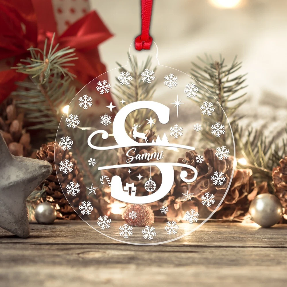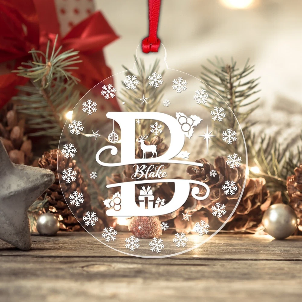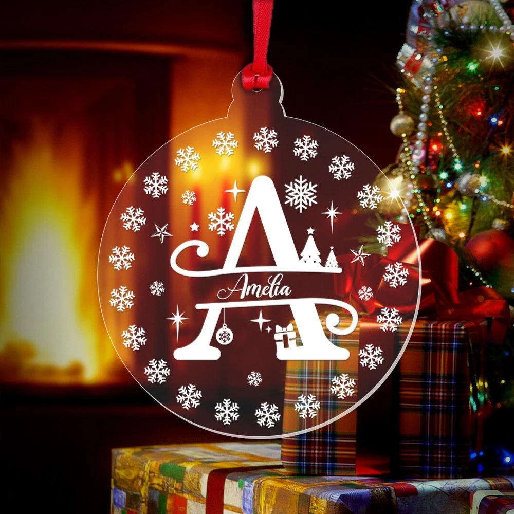 Decorate your Christmas Tree or Home with this Beautiful Personalised Clear Acrylic Christmas Bauble! Ideal as a Christmas Gift and will become a Treasured Keepsake! Personalise with any name! Bauble Size: 8cm wide x 9.3cm height Thickness: 3mm Acrylic Please note: This is a flat bauble shaped acrylic hanging decoration (not a sphere) Please note: The design on the bauble will vary depending on the Monogram Letter required – please see the image showing all the letters to get an idea of how the letter required will look Comes complete with Double Sided Red Satin Hanging Ribbon as standard, and supplied in a Beautiful Organza Gift Bag Made from Clear Laser Cut Acrylic. The design is Laser Engraved into the acrylic to give a white/frosted appearance to the engraving. Personalisation: Please enter your required text into the Personalisation Box or in the "Notes to Seller" Box during checkout. Please enter your text exactly as you would like it to appear. All text will be centrally aligned and text will be formatted as entered. If you require any upper case letters, please enter it this way when ordering. Text will be sized to best fill the space. The more characters/letters you enter, the smaller the font will become. Be sure to double check names, spellings, punctuation and capitalisation before sending your text as these cannot be changed once the manufacturing begins. Designed and Manufactured in the UK. Thank you for supporting our small business.