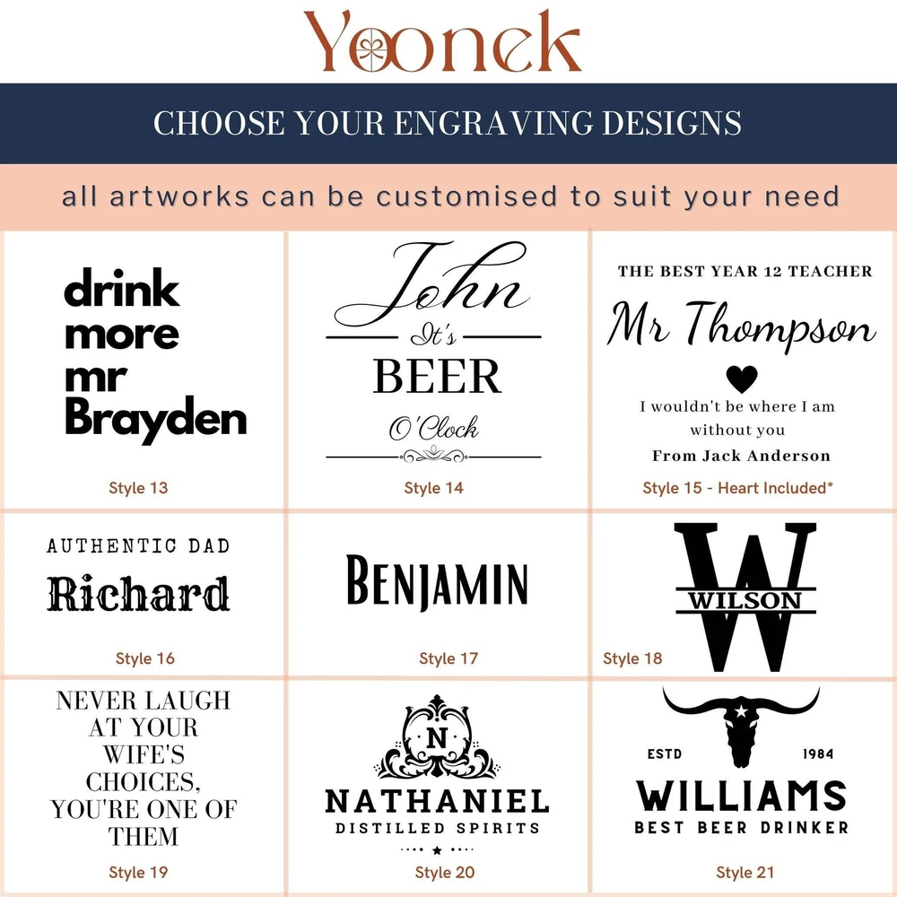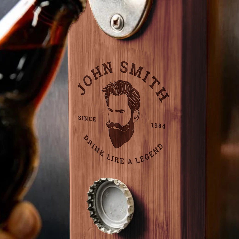 Personalised Wall Mounted Wooden Bottle Opener & Magnetic Cap Catcher Personalised Wall Mounted Wooden Bottle Opener & Magnetic Cap Catcher DETAILS • Introducing our Personalised Wall Mounted Wooden Beer Bottle Opener & Magnetic Cap Catcher: An Ideal Gift for Dads, Weddings, Groomsmen, and Corporate Occasions. Elevate your beer-carrying experience. • Key Features: - This versatile item comes with a powerful magnetic attachment, allowing you to easily affix it to your refrigerator or any metal surface. Alternatively, you can opt for wall mounting using screws, ensuring a secure and stable installation. The magnets are incredibly strong, providing steadfast support without budging, even when faced with external force. Plus, the added convenience of rubber padding on the back guarantees safe usage on any surface, eliminating the risk of damage. With this dependable and user-friendly design, you can enjoy the utmost convenience and peace of mind wherever you choose to use it. - B oasting a charmingly worn vintage style. This unique piece is the perfect accent for any man cave, bar, pub, kitchen, terrace, hut, and more. Add a touch of rustic charm to your space with this stylish and functional accessory. - Effortlessly open your beer with one hand using our cast metal bottle opener. Simply press the lid against the opener, and it drops neatly into the cap catcher. Keep your bar and kitchen tidy, free from chaos. Cheers to convenience! - Installing this convenient bottle opener is a breeze! It features a small hole on the top that easily fits over a nail or screw for hassle-free wall mounting. Enjoy the simplicity of setting up your new favourite bottle opener! - Thoughtfully customised through laser cutting and engraving. - A versatile choice for Dad, weddings, groomsmen, and corporate gifts. - Crafted with care to enhance your overall drinking experience. • Make this Father's Day memorable by selecting a gift that's both distinctive and practical. Our Wooden Wall Mounted Opener resonates with quality and style, encapsulating the essence of a thoughtful present. Elevate Your Experience with our Rustic Vintage Beer Bottle Opener - Personalisation Available! ✔ Personalised Perfection: Tailor this Wall Mounted Wooden Vintage Beer Opener to your liking by adding initials, a name, or even a custom logo. Make it uniquely yours! ✔ Uniqueness Defined: Seeking something extraordinary? Our array of bespoke designs offers a world of options, allowing you to truly stand out. ✔ Ideal for Special Moments: Whether it's a birthday, wedding, housewarming, or any cherished occasion, our personalised Beer/ Beverage/ Drink Bottle Opener makes for an impeccable and distinct gift choice. ✔ Aesthetic & Practical: It seamlessly combines visual appeal with functionality, making it your ideal companion for picnics, trips, and beyond. ✔ Corporate & Promotional Brilliance: Elevate your brand presence by gifting clients our laser-engraved Beer Bottle Opener, adorned with their names, monograms, or your logo. This custom Beer Opener doubles as a standout corporate gift for weddings, business partners, and clients. ✔ Bulk Orders Welcome: Planning a corporate event or wedding? Reach out to us for a tailored quote on bulk orders. ✔ Enduring Elegance: Our high-quality laser engravings ensure a permanent and lasting design that far surpasses vinyl stickers, guaranteeing timeless beauty. ✔ Stylish Versatility: With an expansive array of engraving designs, our Beer Bottle Opener with Cap Collector exemplifies both style and choice, ensuring you find the perfect match. SPECIFICATIONS Material: Wood & Metal Dimension: Height x Width: 20 x 8 cm (18" x 3.1") Technique: Laser Engraved. Personalise any design with any name, date, available template design or custom logo, your own image. Please Note: Due to the nature of wood, the colouring, markings, knots, and rustic characteristics will vary and may result in lighter and darker areas in the engraving. Each item will be unique. You can treat your item with mineral oil to keep it looking great forever! HOW TO ORDER 1. Select your preferred engraving style. 2. Type in exact order you want it engraved based on our provided Design Template Options. You can add additional instructions in ( ) brackets. Example: Carmicheal, Dad's Brewery, Since 1997 ▸If you want to use your own logo, please attach/ send us your file once you finish . Please note to attach the highest resolution file as possible to avoid quality issues Not all files are scanned prior to manufacturing, if you're not sure, please send us an email after placing the order to confirm if the file is of an acceptable quality. ▸You can combine or pick any font, icon, style, etc between our provided designs, or choose not to include a date, title or icon for example. All artwork based on our available design is free of charge. ▸If you don't like any of our template and want to create your own bespoke artwork design, please feel free to contact us with any questions you may have, a small additional fee may apply. DELIVERY TIME Processing Time: Upon placing an order, our dedicated team initiates the meticulous process of designing your artwork(s), collecting your item(s), crafting your personalised product(s), and carefully packaging it. The duration of production varies based on the chosen production process and the complexity involved. Please find below estimated turnaround times: Item Type Processing Time* Rush Order (25% Surcharge)* Non-Personalised Items 1-2 business days - Personalised Items 2-7 business days 1-2 business days Signs & Hoops 3-10 business days 1-3 business days * The provided processing time does not include the duration required for customer artwork approval. Timely responses to artwork confirmation emails are crucial, as any delays in approval will extend the overall processing time. Rush Order option is available during checkout. Shipping Time: We send out your order when all items a