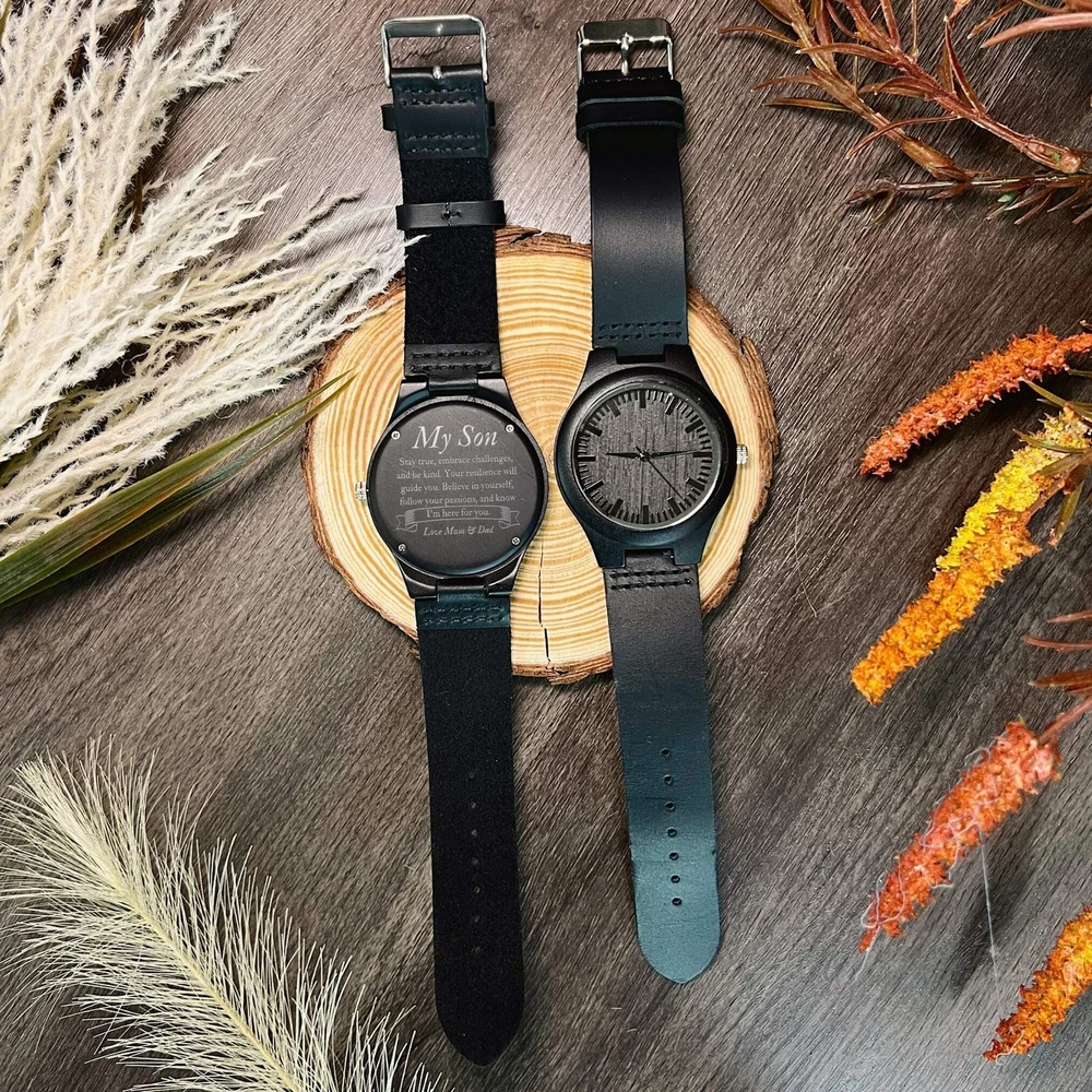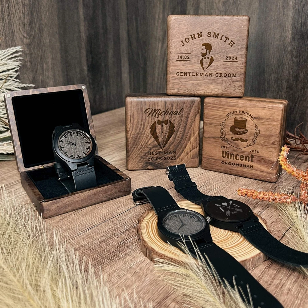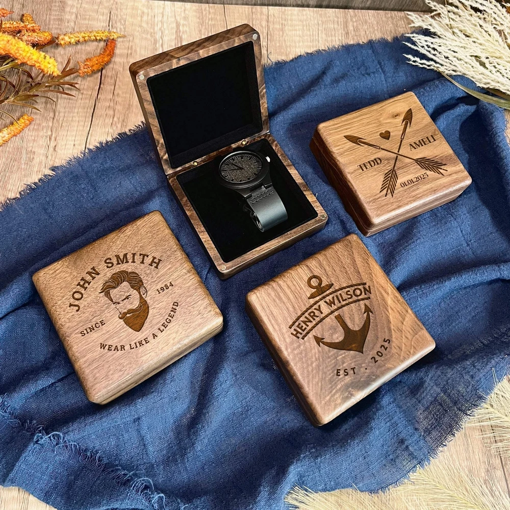 Personalised Wooden Watch & Walnut Box Personalised Wooden Watch & Walnut Box DETAILS • Personalised Wooden Watch in Walnut Box Gift Set Make every occasion unforgettable with our exquisite Custom Engraved Wooden Watch, elegantly presented in a luxurious Walnut Box Gift Set. Featuring a built-in magnetic clasp for secure closure, this set combines sophistication with practicality, ensuring your precious watch remains protected. Ideal for birthdays, housewarmings, groomsmen, husbands, boyfriends, Father's Day, weddings, corporate events, and more, our watches are the epitome of style and sentiment. • Perfect for Special Occasions Whether it's an outdoor wedding celebration or a trendy corporate event, our wooden walnut wedding watch add a touch of elegance to any gathering. Imagine your entire wedding party sporting matching personalised watch, creating lasting memories for everyone involved. They make ideal personalised gifts for groomsmen, best man, or anyone special in your life. The included wooden box adds an extra layer of elegance and sophistication to your gift. • Product Features: - Reliable Japanese quartz movement for precise timekeeping, energy efficiency, and long-lasting performance. - Each watch is meticulously handcrafted, reflecting fine craftsmanship and attention to detail. - Crafted from walnut wood, each watch is distinguished by its unique grain pattern, offering a natural and timeless aesthetic. - High-quality, durable genuine leather straps, ensuring durability, comfort, and a sophisticated look. - Scratch-resistant mineral glass watch surface. - Unique wood grain pattern on each watch case. • Personalised Perfection Make your gift truly unique with our laser engraving service. Add a personal touch that sets your gift apart, choosing from our extensive design selection or providing your own image or logo for a bespoke creation. • Versatile and Unique Our Wooden Watch & Walnut Box Gift Set isn't just for special occasions; it's also perfect for client gifts or company promotions. With its timeless appeal and customisation options, it's a versatile choice for any occasion or purpose. SPECIFICATIONS Dimensions : - Watch: ++Band Length: 225 mm (8") ++ Band Width: 24 mm (0.9") ++ Case Thickness: 11 mm (0.43") ++ Dial Diameter: 45 mm (1.7") - Box Case: W x L x H: 10 x 10 x 3.4 cm ( 3.9" x 3.9" x 1.3") Technique: Laser Engraved: Personalise any design with any name, date, available template design or custom logo, your own image. Material: Walnut, Leather Note: Due to the nature of wood, the colouring, markings, knots, and rustic characteristics will vary and may result in lighter and darker areas in the engraving and wooden items. Each item will be unique. HOW TO ORDER 1. Select Watch Options: Choose your desired watch specifications from the drop-down menu. 2. Select Box Case Options: Choose your preferred options for the box case from the drop-down menu. 3. Provide Artwork Style #: Type in the artwork style number for both the watch and box case based on our provided design template options. Enter the exact order details, including any additional instructions within parentheses ( ), to ensure your customisation preferences are accurately fulfilled. Example: Box: #27 - Authentic Dad, Richard Watch: #51 - Best Dad Ever, Love, Jessica ▸ If you want to use your own logo, please attach/ send us your file once you finish . Please note to attach the highest resolution file as possible to avoid quality issues. Not all files are scanned prior to manufacturing, if you're not sure, please send us an email after placing the order to confirm if the file is of an acceptable quality. ▸You can combine or pick any font, icon, style, etc between our provided designs, or choose not to include a date, title or icon for example. All artwork based on our available design is free of charge. ▸If you don't like any of our template and want to create your own bespoke artwork design, please feel free to contact us with any questions you may have, a small additional fee may apply. DELIVERY TIME Processing Time: Upon placing an order, our dedicated team initiates the meticulous process of designing your artwork(s), collecting your item(s), crafting your personalised product(s), and carefully packaging it. The duration of production varies based on the chosen production process and the complexity involved. Please find below estimated turnaround times: Item Type Processing Time* Rush Order (25% Surcharge)* Non-Personalised Items 1-2 business days - Personalised Items 2-7 business days 1-2 business days Signs & Hoops 3-10 business days 1-3 business days * The provided processing time does not include the duration required for customer artwork approval. Timely responses to artwork confirmation emails are crucial, as any delays in approval will extend the overall processing time. Rush Order option is available during checkout. Shipping Time: We send out your order when all items are ready. The delivery time varies based on your chosen shipping options and location. After shipping, you'll get a confirmation email with a tracking number. If there are no scans in the first 24 hours, don't worry—sometimes the system takes a day or so to catch up. Our carriers estimate delivery times: Region/Country Standard Shipping* Express Shipping* Australia 2-4 business days 1-3 business days New Zealand 5-8 business days 2-5 business days United States 6-9 business days 3-6 business days Canada 6-9 business days 3-6 business days United Kingdom 6-8 business days 4-6 business days Europe 6-14+ business days 4-10+ business days Middle East 6-12+ business days 4-8+ business days Singapore 5-7 business days 3- 6 business days Hong Kong 5-9 business days 3-6 business days Rest of Asia 3-14 business days 1-5 business days Rest of the World 6-14+ business days 1-5 business days * Please be advised that the provided delivery estimates are general approximations, and the actual delivery times may vary based on