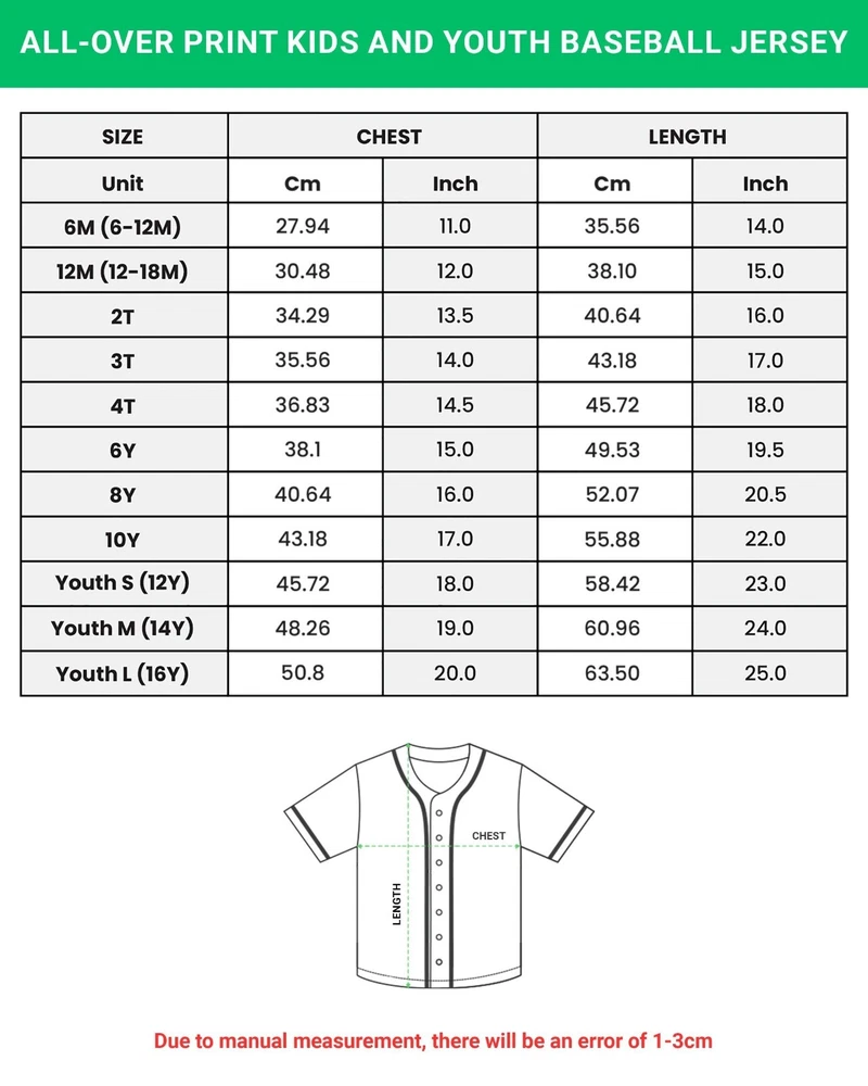 Custom Sports Jersey, Baseball and Basketball Team Outfit Jersey 6M - 16Y Product Description ✨All sizes are Unisex. Regular fit. ✨ Fabric: Polyester ✨ Great for groups: school uniforms, baseball team, easy to customize. Feel free to create a design with our custom baseball jerseys. You can put the player names or logo on our great quality baseball jerseys with full Button Down Closure. ✨ Suitable for different occasions such as hanging out with friends, going to sporting events, or even wear them as custom baseball uniforms if you are in uniform needs with your team,... ✨IMPORTANT: CARE INSTRUCTION DO cold machine wash, DO tumble dry low, DO NOT bleach (only non-chlorine bleach when needed), DO NOT dry clean, DO NOT iron (c ool iron if needed). ✨Policy: * Exchange or refund items are unacceptable since we create each shirt to your specifications unless an item you received has a major problem. This is when the item is: - Design errors/wrong order: Completely wrong design compared to information provided by customers on Ebay. - Bad quality: blurry image/print. - Significantly different from the description. - Defective/Damaged due to the fault of our factory or the carrier; - Order was sent to the wrong address. * We WON'T take any responsibility for INCORRECT address, so please check your address carefully before checkout. ✨Note: * Due to the lighting effect and computer color, the actual color may be slightly different from the picture, please understand. * Kindly let us know the DATE you need the shirts via Ebay message or note after you purchased so we can support you better. Have a design in mind that you didn’t find? Message me about custom orders! I enjoy working with others and using my craft to make them happy.