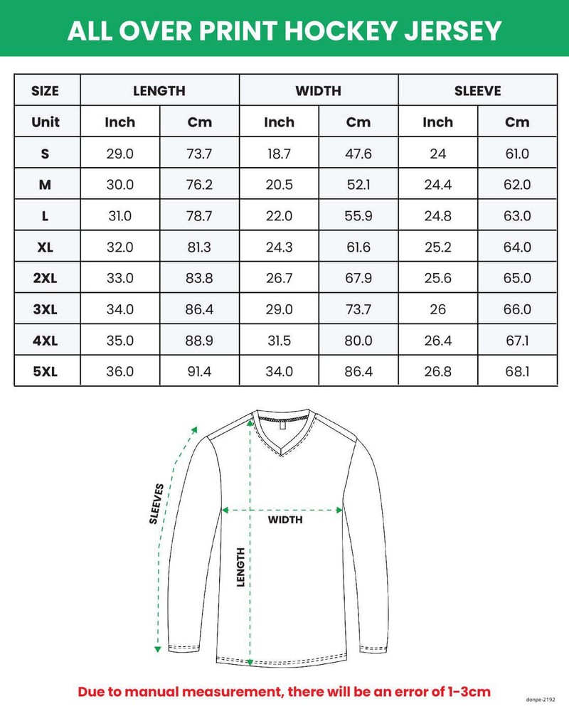 Let this All-over Print Hockey Jersey bring you the ultimate comfort and performance while keeping you in style. Material: Premium Bird-eye Pique Fabric with 3-5% Spandex - Super lightweight and breathable fabric allows optimal airflow, keeping you cool and comfortable during intense activities. The addition of Spandex offers excellent flexibility that allow yout o reach a full range of motion without any restriction. Relaxed Fit: Sporty and comfortable fit to match your daily style, and compliment your casual outfits. Sublimation printing provides high durability, long-lasting prints and colors. Whether you're on the ice, at the gym, or out with friends, our All-over Print Hockey Jersey delivers the perfect blend of style, comfort, and functionality. Make it your go-to choice for any activity and experience the difference! Size chart information: Colors: Sizes: S, M, L, XL, 2XL, 3XL, 4XL, 5XL Due to the difference between different monitors, the divicture may not reflect the actual color of the item. Compare the detail sizes with yours, please allow 1-2 cm variations due to manual measurement.