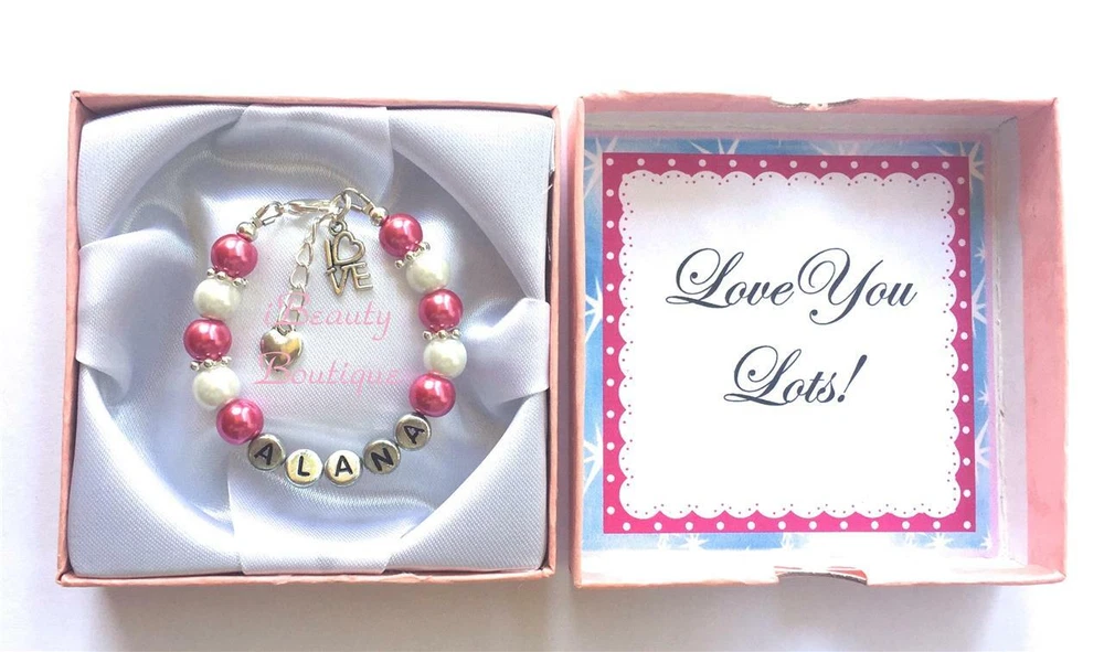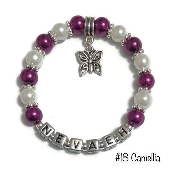 Personalized BUTTERFLY Charm Girl's Stretch Bracelet-Gift For Her-Birthday Gift Personalized BUTTERFLY Charm Girl's Stretch Bracelet-Gift For Her-Birthday Gift Description Personalized Girl's Stretch Bracelet with BUTTERFLY Charm This would be perfect for a Birthday/Christmas/Holidays/party favors or any occasion gift. Bracelets are made to order, so there may be more or fewer beads to accommodate size. Please indicate the child's name, color & your message (gift box only) in the notes section when you place your order. Please note that children under 3 years of age should only wear this bracelet with adult supervision. Choice of Pearl color: 1. Hot Pink 2. White 3. Lt. Blue 4. Dk. Orchid 5. Rosy Brown 6. Med Violet Red 7. Deep Pink 8. Fire Brick 9. Lt. Peach 10. Lt. Bronze 11. Peach 12. Black 13. Coral 14. Dk. Green 15. Ivory 16. Lt. Cyan 17. Pale Violet Red 18. Camellia 19. Aquamarine 20. Dk Slate Blue 21. Pink 22. Pale Green 23. Teal 24. Silver 25. Lavender 26. Cornflower Blue 27. Crimson 28. Fuchsia 29. Dark Blue 30. Dark Turquoise 31. Steel Blue 32. Gold 33. Indigo 34. Red 35. Blue Violet 36. Burgundy 37. Olive 38. Green 39. Marine Blue 40. Pale Pink Camellia #18 as the above model will be sent if you are not choosing the pearl color. 300+ Listing Templates! Auctiva gets you noticed! The complete eBay Selling Solution. Track Page Views With Auctiva's FREE Counter