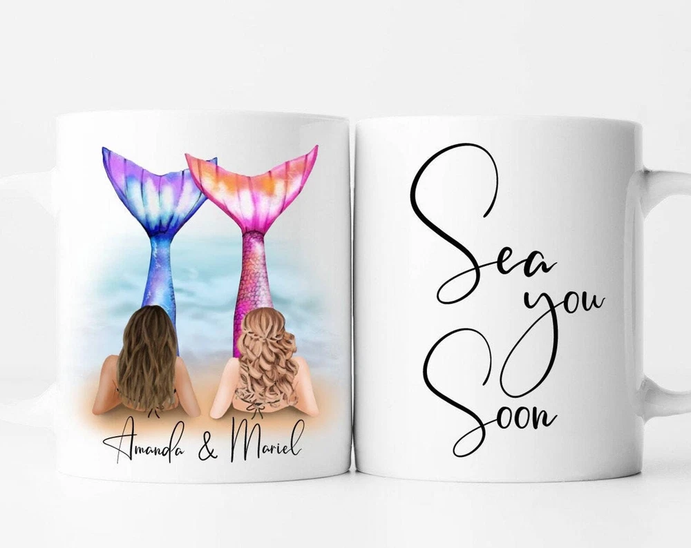 Personalized Best Friends Mug Mermaids Mug See You Soon Friendship Mug Thinking Product Details.. This high quality 11oz. ceramic white mug has a premium hard coat that provides crisp and vibrant color reproduction sure to last for years. Perfect for all hot & cold beverages. The highest quality printing possible is used. It will never fade no matter how many times you wash it. Material: 100% Ceramic. Print both sides. Dishwasher and Microwave Safe. High Gloss + Premium White Finish. Printed in the U.S.A. Personalized & Custom. We support personalized and custom mug to add custom, when placing an order, you can add notes to the "order note" in shipping address section. Also you can contact us directly via message. Shipping Info. Ready to ship in 1 to 2 business days, All products are made-to-order and proudly printed in the United States. Shipped by USPS and DHL, You will receive your order in 5-7 days. Replace & Refund. All products are defective during shipping broken, chipped will be replaced free of charge. You are not satisfied with the product, we will refund 100% money to you. If any other issues arise, please do not hesitate to message, we would be more than happy to assist you.