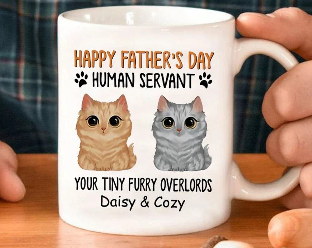 Personalized Big Eyes Cat Human Servant Mug Custom Cat Dad Mug With Names Funny Cat Dad Mug Funny Fathers Day Gift Mug Cat Lover Gifts Product Details.. This high quality 11oz. ceramic white mug has a premium hard coat that provides crisp and vibrant color reproduction sure to last for years. Perfect for all hot & cold beverages. The highest quality printing possible is used. It will never fade no matter how many times you wash it. Material: 100% Ceramic. Print both sides. Dishwasher and Microwave Safe. High Gloss + Premium White Finish. Printed in the U.S.A. Personalized & Custom. We support personalized and custom mug to add custom, when placing an order, you can add notes to the "order note" in shipping address section. Also you can contact us directly via message. Shipping Info. Ready to ship in 1 to 2 business days, All products are made-to-order and proudly printed in the United States. Shipped by USPS and DHL, You will receive your order in 5-7 days. Replace & Refund. All products are defective during shipping broken, chipped will be replaced free of charge. You are not satisfied with the product, we will refund 100% money to you. If any other issues arise, please do not hesitate to message, we would be more than happy to assist you.