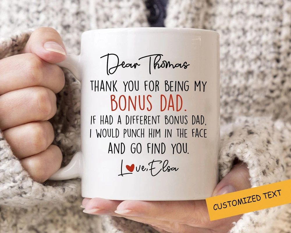 Personalized Bous Dad Mug Best Gift For Bonus Dad Fathers Day Gift Birthday Mug Product Details.. This high quality 11oz. ceramic white mug has a premium hard coat that provides crisp and vibrant color reproduction sure to last for years. Perfect for all hot & cold beverages. The highest quality printing possible is used. It will never fade no matter how many times you wash it. Material: 100% Ceramic. Print both sides. Dishwasher and Microwave Safe. High Gloss + Premium White Finish. Printed in the U.S.A. Personalized & Custom. We support personalized and custom mug to add custom, when placing an order, you can add notes to the "order note" in shipping address section. Also you can contact us directly via message. Shipping Info. Ready to ship in 1 to 2 business days, All products are made-to-order and proudly printed in the United States. Shipped by USPS and DHL, You will receive your order in 5-7 days. Replace & Refund. All products are defective during shipping broken, chipped will be replaced free of charge. You are not satisfied with the product, we will refund 100% money to you. If any other issues arise, please do not hesitate to message, we would be more than happy to assist you.