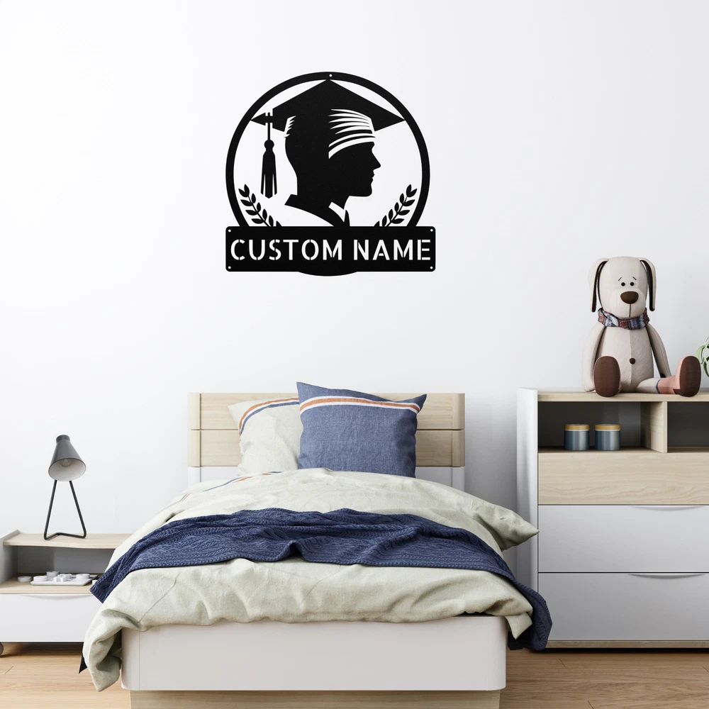 Product Description Personalized Boy Grad Cap Metal Sign Custom Graduation Decor Unique Gift Idea Celebrate a milestone achievement with the Personalized Boy Grad Cap Metal Sign ! This charming sign is a fantastic way to recognize a graduate and add a personal touch to any space. Crafted from 16 gauge high-quality metal , this sign is built to last. The powder coating provides excellent protection, making it dust, weather, and water-resistant for both indoor and outdoor display. Key features include: Customizable Design: Personalize with the graduate’s name and graduation year. Durable Construction: Made from high-quality metal for long-lasting use. Ideal Gift: Perfect for graduations, birthdays, or any special occasion. Stylish Decor: Great addition to home, office, or dorm room decoration. Honor the achievements of a special graduate with the Personalized Boy Grad Cap Metal Sign . It’s not just a decoration; it’s a treasured keepsake celebrating success! Service and Color Choice Our metal signs are designed to be personalized just for you, making them the perfect addition to any space! The default color for our signs is Black , but we also offer a variety of beautiful options including Copper, Gold, White, and Silver . After placing your order, simply contact us with your preferred color choice, and we'll ensure your sign is exactly how you envision it. Let’s create something special together!