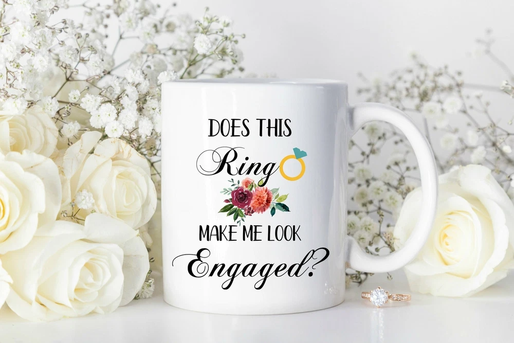 Personalized Bride Mug Customizable Mug Does This Ring Make Me Look Engaged Mug Product Details.. This high quality 11oz. ceramic white mug has a premium hard coat that provides crisp and vibrant color reproduction sure to last for years. Perfect for all hot & cold beverages. The highest quality printing possible is used. It will never fade no matter how many times you wash it. Material: 100% Ceramic. Print both sides. Dishwasher and Microwave Safe. High Gloss + Premium White Finish. Printed in the U.S.A. Personalized & Custom. We support personalized and custom mug to add custom, when placing an order, you can add notes to the "order note" in shipping address section. Also you can contact us directly via message. Shipping Info. Ready to ship in 1 to 2 business days, All products are made-to-order and proudly printed in the United States. Shipped by USPS and DHL, You will receive your order in 5-7 days. Replace & Refund. All products are defective during shipping broken, chipped will be replaced free of charge. You are not satisfied with the product, we will refund 100% money to you. If any other issues arise, please do not hesitate to message, we would be more than happy to assist you.