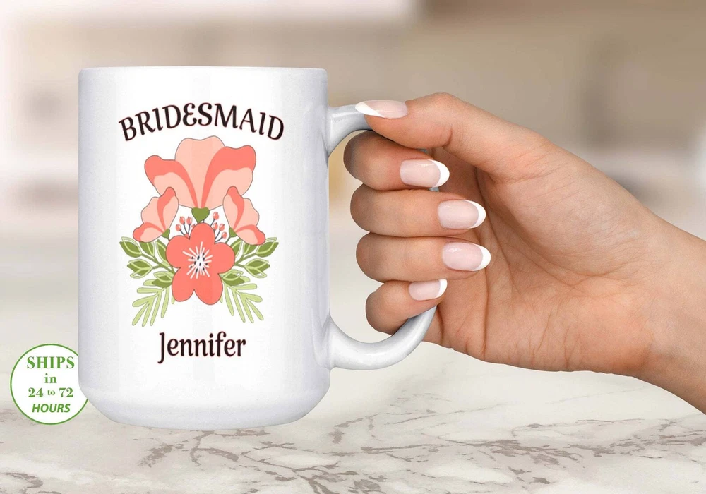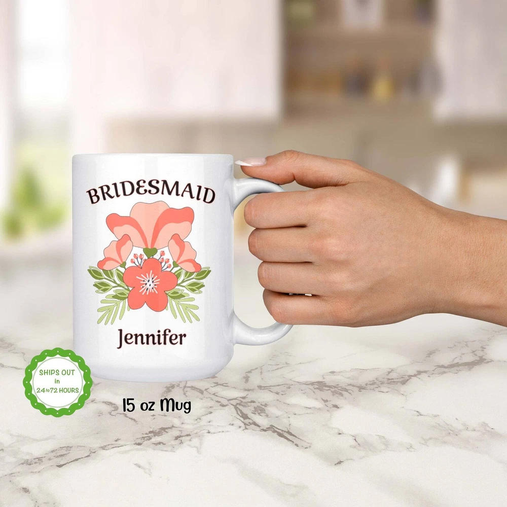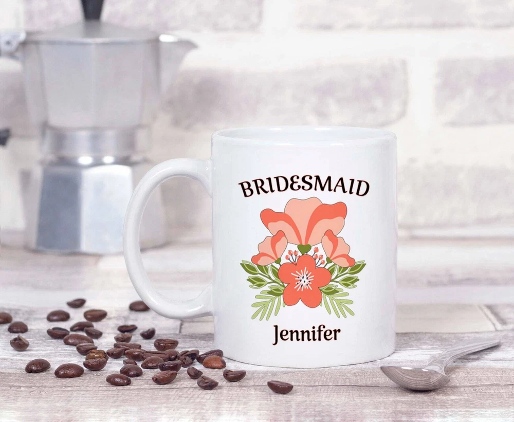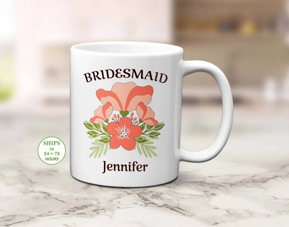 Personalized Bridesmaid Mug Orange Flower Bridesmaid Mug Custom Bridesmaid Gift Product Details.. This high quality 11oz. ceramic white mug has a premium hard coat that provides crisp and vibrant color reproduction sure to last for years. Perfect for all hot & cold beverages. The highest quality printing possible is used. It will never fade no matter how many times you wash it. Material: 100% Ceramic. Print both sides. Dishwasher and Microwave Safe. High Gloss + Premium White Finish. Printed in the U.S.A. Personalized & Custom. We support personalized and custom mug to add custom, when placing an order, you can add notes to the "order note" in shipping address section. Also you can contact us directly via message. Shipping Info. Ready to ship in 1 to 2 business days, All products are made-to-order and proudly printed in the United States. Shipped by USPS and DHL, You will receive your order in 5-7 days. Replace & Refund. All products are defective during shipping broken, chipped will be replaced free of charge. You are not satisfied with the product, we will refund 100% money to you. If any other issues arise, please do not hesitate to message, we would be more than happy to assist you.