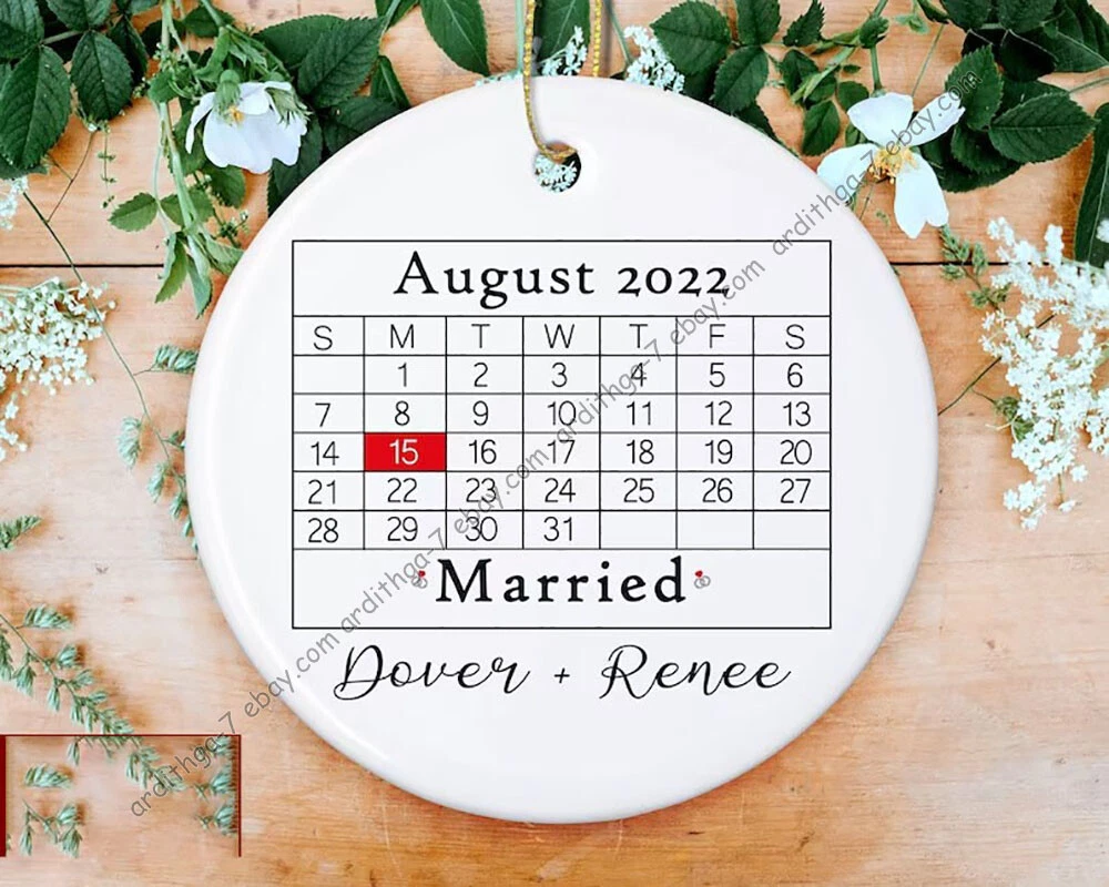 Personalized Calendar Ornament, Married Ornament, Wedding Gift, Anniversary Ornament, Our First Christmas, Newlywed Gift, Marriage Ornament If you need to buy more, please inbox us We have two material options (Ceramic & MDF), please read the product description as below to choose your favorite options. MDF Ornaments 1-sided design. Print type: Sublimation printing. Crafted from durable MDF with a high-gloss plastic finish so your designs last a lifetime. Shapes: Round, star, heart and oval . Product Dimensions: Circle & Heart, 2.75” tall; Oval & Star, 3.25” tall. Ships with a festive gold cord for easy hanging. CERAMIC Ornaments 125" (3mm), 2.75" height (circle), thick high-quality porcelain One-sided print Hole for the hanging string Gold-toned string included Available in 4 shapes - Snowflake, Star, Heart and Circle The height of the hole can slightly deviate Shipping, Return and Refund Policy On average, merchandise is produced and shipped from our facility 2-4 business days after purchase. Standard Shipping: 5-7 working days for USA. Please contact us if you have any dissatisfaction with the item you buy so that we give you the solution. It is easier for us to handle your issue if you send us the proof like an image. We can replace another within 30 days without fee if the item is defective, damaged, or an error is made on our end.