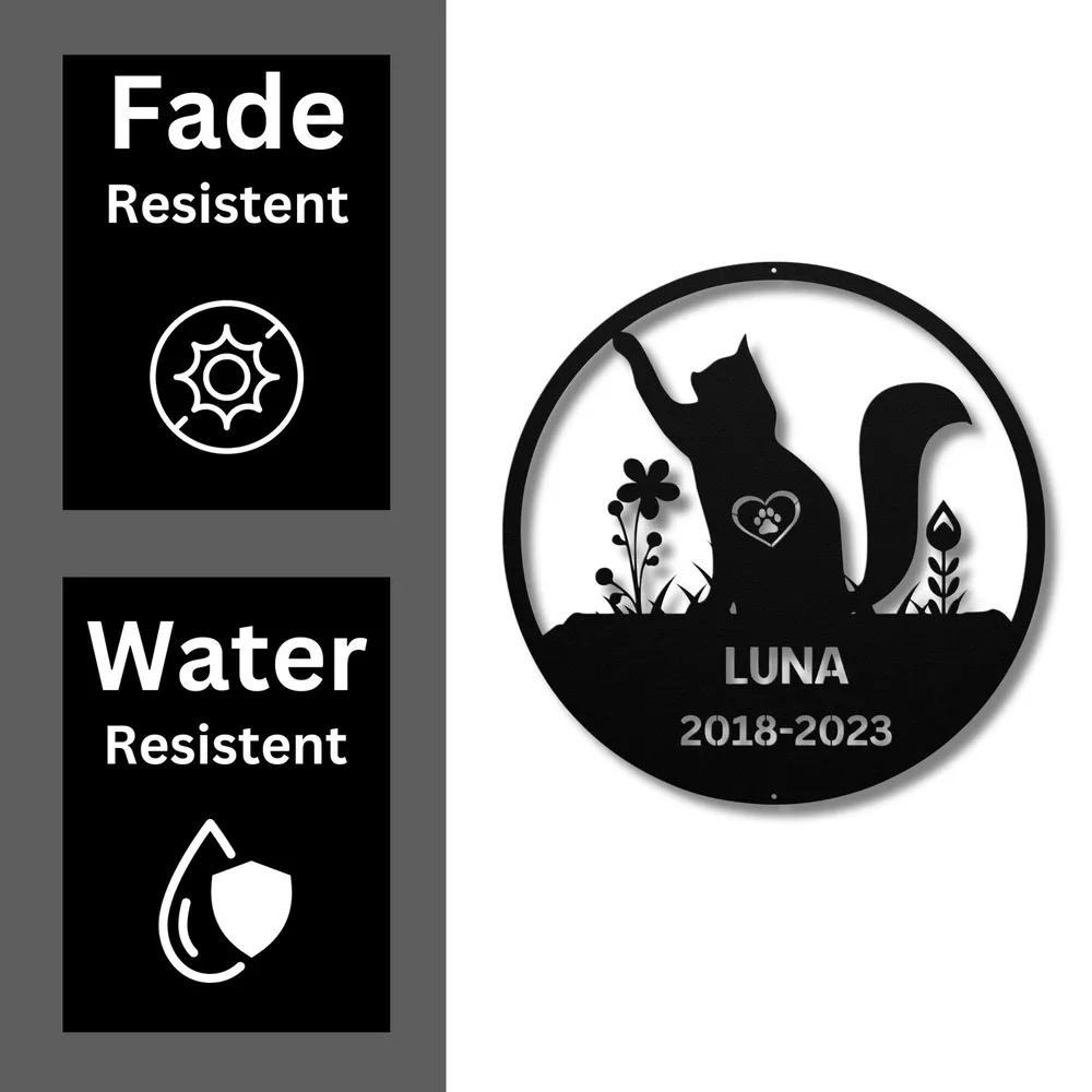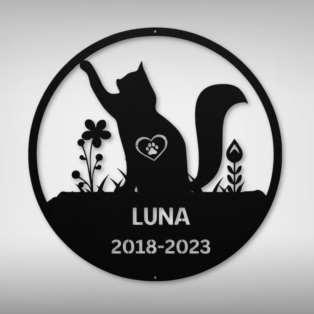 Product Description Personalized Cat Memorial Metal Sign Custom Pet Tribute Decor Gift for Cat Owner Cherish the memory of your beloved feline companion with our Personalized Cat Memorial Metal Sign . This touching tribute is perfect for honoring your cherished pet and can be displayed in your home or garden. Crafted from 16 gauge high-quality metal , this sign is built to last. It features a powder coating that makes it dust, weather, and water-resistant , ensuring it remains beautiful in any setting. Key features include: Customizable Design: Personalize with your cat’s name and a special message for a heartfelt tribute. Durable Construction: Made from high-quality metal to withstand the elements and time. Thoughtful Gift: A meaningful gift for pet lovers, perfect for Christmas, birthdays, or any special occasion. Beautiful Decoration: A lovely addition to your home or garden, creating a lasting memory of your furry friend. Celebrate the love and joy your cat brought into your life with the Personalized Cat Memorial Metal Sign . It’s a beautiful way to remember and honor your cherished pet for years to come. Service and Color Choice Our metal signs are designed to be personalized just for you, making them the perfect addition to any space! The default color for our signs is Black , but we also offer a variety of beautiful options including Copper, Gold, White, and Silver . After placing your order, simply contact us with your preferred color choice, and we'll ensure your sign is exactly how you envision it. Let’s create something special together!