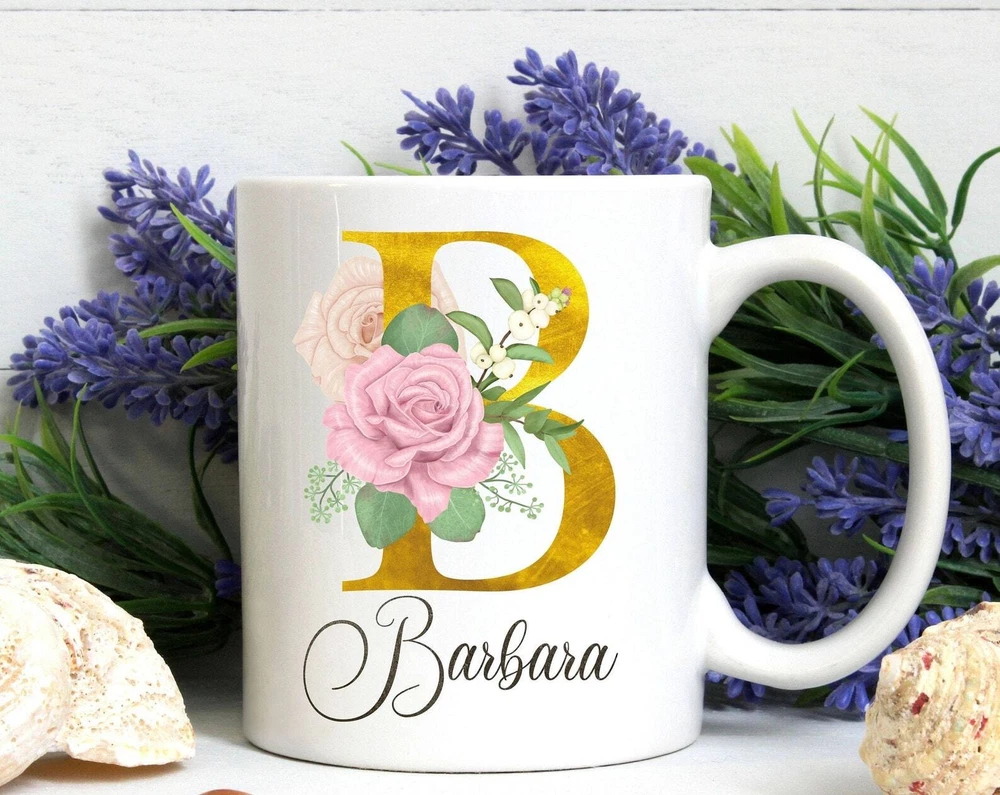 Personalized Coffee Mug Gold Letter Initial Name With Flowers Modern Mug Product Details.. This high quality 11oz. ceramic white mug has a premium hard coat that provides crisp and vibrant color reproduction sure to last for years. Perfect for all hot & cold beverages. The highest quality printing possible is used. It will never fade no matter how many times you wash it. Material: 100% Ceramic. Print both sides. Dishwasher and Microwave Safe. High Gloss + Premium White Finish. Printed in the U.S.A. Personalized & Custom. We support personalized and custom mug to add custom, when placing an order, you can add notes to the "order note" in shipping address section. Also you can contact us directly via message. Shipping Info. Ready to ship in 1 to 2 business days, All products are made-to-order and proudly printed in the United States. Shipped by USPS and DHL, You will receive your order in 5-7 days. Replace & Refund. All products are defective during shipping broken, chipped will be replaced free of charge. You are not satisfied with the product, we will refund 100% money to you. If any other issues arise, please do not hesitate to message, we would be more than happy to assist you.