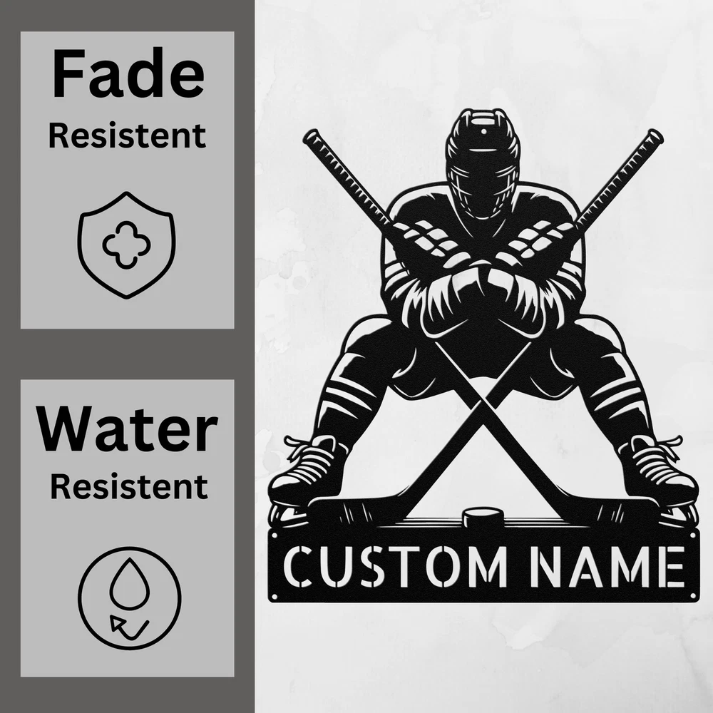 Product Description Personalized Crossed Hockey Metal Sign Custom Hockey Decor Gift for Sports Fans Show off your love for hockey with our Personalized Crossed Hockey Metal Sign ! This sign is a perfect addition to any home, office, or sports room, making it a must-have for hockey fans of all ages. Crafted from 16 gauge high-quality metal , this sign is designed to last. The powder coating makes it dust, weather, and water-resistant , ensuring it looks great indoors or outdoors. Key features include: Customizable Design: Add your name or favorite team to make it truly yours. Durable and Long-Lasting: Built to withstand the elements while maintaining its vibrant look. Perfect Gift Idea: An excellent choice for Christmas, birthdays, or any special occasion for hockey lovers. Stylish Decor: A fantastic way to enhance your game room, man cave, or office with a sporty touch. Celebrate your passion for hockey with the Personalized Crossed Hockey Metal Sign . It’s more than just a sign; it’s a statement of your love for the game! Service and Color Choice Our metal signs are designed to be personalized just for you, making them the perfect addition to any space! The default color for our signs is Black , but we also offer a variety of beautiful options including Copper, Gold, White, and Silver . After placing your order, simply contact us with your preferred color choice, and we'll ensure your sign is exactly how you envision it. Let’s create something special together!