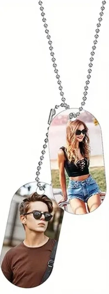 This personalized custom photo dog tag necklace features a rectangular pendant made of silver stainless steel, with a length of 23.5 inches. The necklace can be customized with a photo or text of your choice, making it a unique and thoughtful gift. The pendant is reversible and adjustable, allowing for versatile styling options. Simply provide the desired personalization details in the "contact seller" section when placing your order. The chain can be shortened providing length of your choice, as shown in 1 of the pictures for a double set of dog tag photos.