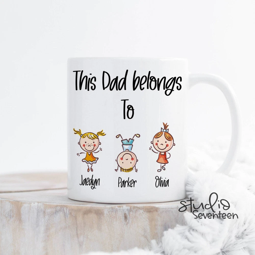 Personalized Dad Coffee Mug With Kids Names This Dad Belongs To Custom Birthday Product Details.. This high quality 11oz. ceramic white mug has a premium hard coat that provides crisp and vibrant color reproduction sure to last for years. Perfect for all hot & cold beverages. The highest quality printing possible is used. It will never fade no matter how many times you wash it. Material: 100% Ceramic. Print both sides. Dishwasher and Microwave Safe. High Gloss + Premium White Finish. Printed in the U.S.A. Personalized & Custom. We support personalized and custom mug to add custom, when placing an order, you can add notes to the "order note" in shipping address section. Also you can contact us directly via message. Shipping Info. Ready to ship in 1 to 2 business days, All products are made-to-order and proudly printed in the United States. Shipped by USPS and DHL, You will receive your order in 5-7 days. Replace & Refund. All products are defective during shipping broken, chipped will be replaced free of charge. You are not satisfied with the product, we will refund 100% money to you. If any other issues arise, please do not hesitate to message, we would be more than happy to assist you.