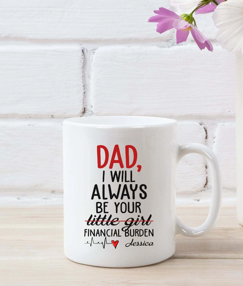 Personalized Dad Financial Burden Mug Fathers Day Cup Gift For Dad Gift From Product Details.. This high quality 11oz. ceramic white mug has a premium hard coat that provides crisp and vibrant color reproduction sure to last for years. Perfect for all hot & cold beverages. The highest quality printing possible is used. It will never fade no matter how many times you wash it. Material: 100% Ceramic. Print both sides. Dishwasher and Microwave Safe. High Gloss + Premium White Finish. Printed in the U.S.A. Personalized & Custom. We support personalized and custom mug to add custom, when placing an order, you can add notes to the "order note" in shipping address section. Also you can contact us directly via message. Shipping Info. Ready to ship in 1 to 2 business days, All products are made-to-order and proudly printed in the United States. Shipped by USPS and DHL, You will receive your order in 5-7 days. Replace & Refund. All products are defective during shipping broken, chipped will be replaced free of charge. You are not satisfied with the product, we will refund 100% money to you. If any other issues arise, please do not hesitate to message, we would be more than happy to assist you.
