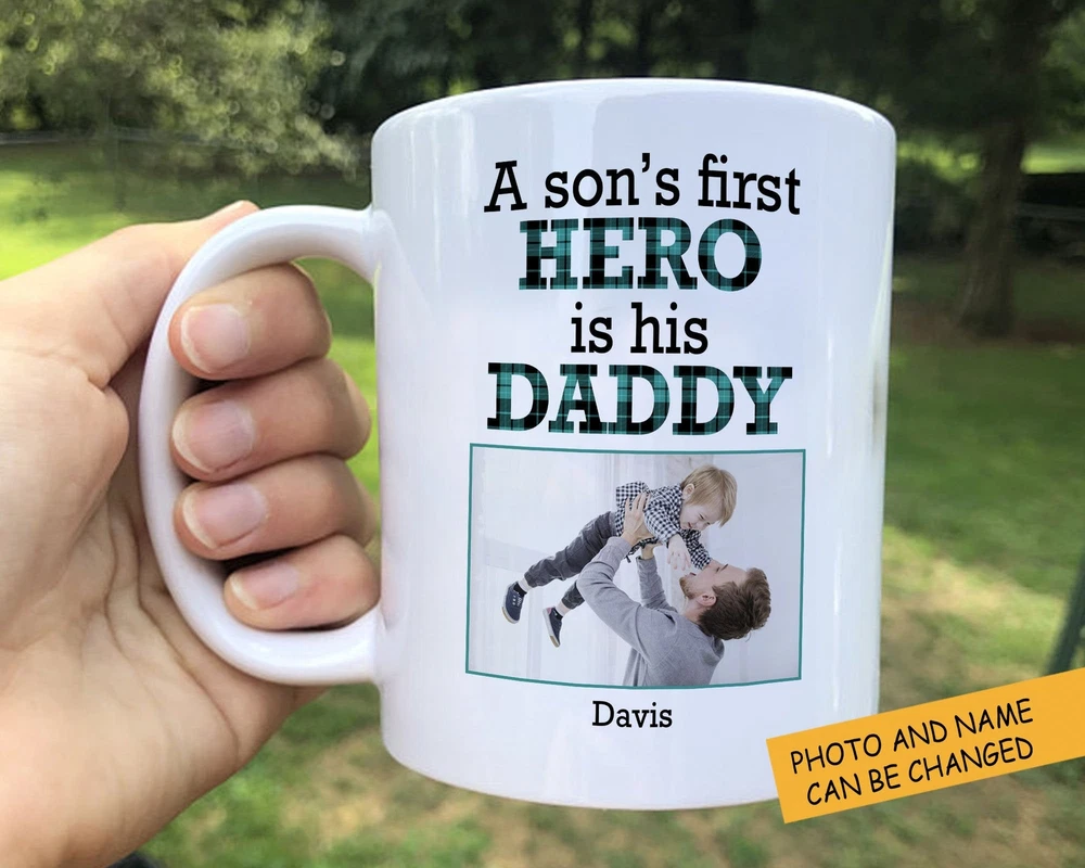 Personalized Dad Mug Father's Day Gift Mug A Son's First Hero Is His Daddy Product Details.. This high quality 11oz. ceramic white mug has a premium hard coat that provides crisp and vibrant color reproduction sure to last for years. Perfect for all hot & cold beverages. The highest quality printing possible is used. It will never fade no matter how many times you wash it. Material: 100% Ceramic. Print both sides. Dishwasher and Microwave Safe. High Gloss + Premium White Finish. Printed in the U.S.A. Personalized & Custom. We support personalized and custom mug to add custom, when placing an order, you can add notes to the "order note" in shipping address section. Also you can contact us directly via message. Shipping Info. Ready to ship in 1 to 2 business days, All products are made-to-order and proudly printed in the United States. Shipped by USPS and DHL, You will receive your order in 5-7 days. Replace & Refund. All products are defective during shipping broken, chipped will be replaced free of charge. You are not satisfied with the product, we will refund 100% money to you. If any other issues arise, please do not hesitate to message, we would be more than happy to assist you.