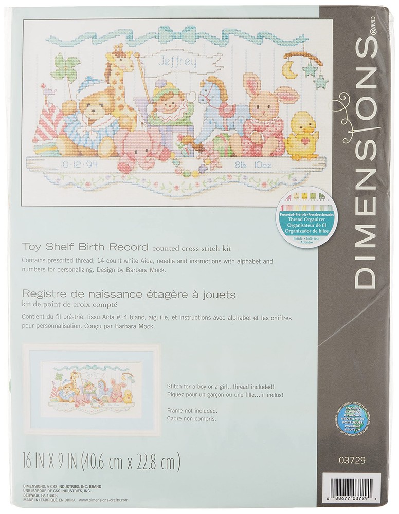 Celebrate a new addition to the family with our Toy Shelf Birth Record Counted Cross Stitch Kit! This counted cross stitch embroidery kit is easy to personalize with baby's name and birthday. Featuring a child's toys lined on a shelf with space to personalize your child's name, this unique gift for new parents is sure to be cherished for years to come! Includes cotton embroidery thread, 14-count white Aida, thread palette, needle and easy instructions including alphabet and number chart for personalizing. Finished design measures 16'' W x 9'' H. Kit contains cotton embroidery thread, 14-count white Aida, thread palette, needle and easy instructions including alphabet and number chart for personalizing Finished design measures 16'' W x 9'' H Easy cross stitch kit pictures a child's toys lined on a shelf with space to personalize your child's name. Toy shelf cross stitch activity is perfect for beginners with easy-to-follow instructions. Counted cross stitch kit makes a great gift for soon-to-be parents!