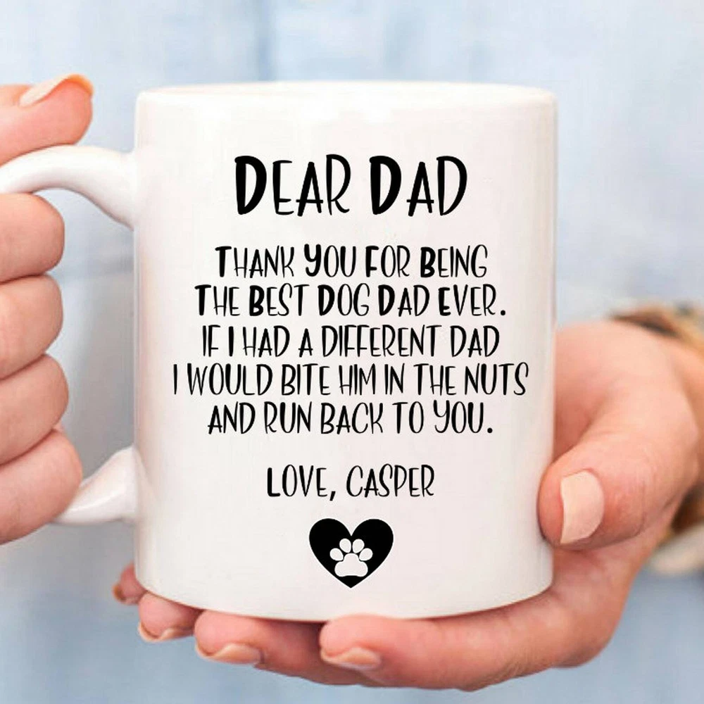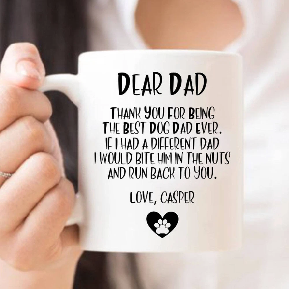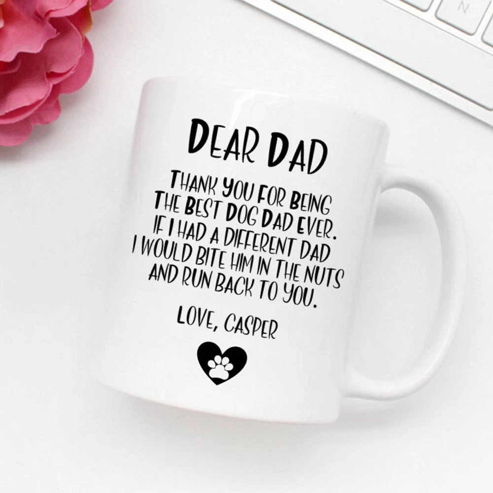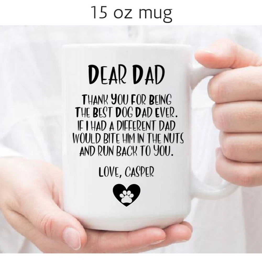 Personalized Dog Dad Mug Dog Owner Gift Dog Dad Gift Product Details.. This high quality 11oz. ceramic white mug has a premium hard coat that provides crisp and vibrant color reproduction sure to last for years. Perfect for all hot & cold beverages. The highest quality printing possible is used. It will never fade no matter how many times you wash it. Material: 100% Ceramic. Print both sides. Dishwasher and Microwave Safe. High Gloss + Premium White Finish. Printed in the U.S.A. Personalized & Custom. We support personalized and custom mug to add custom, when placing an order, you can add notes to the "order note" in shipping address section. Also you can contact us directly via message. Shipping Info. Ready to ship in 1 to 2 business days, All products are made-to-order and proudly printed in the United States. Shipped by USPS and DHL, You will receive your order in 5-7 days. Replace & Refund. All products are defective during shipping broken, chipped will be replaced free of charge. You are not satisfied with the product, we will refund 100% money to you. If any other issues arise, please do not hesitate to message, we would be more than happy to assist you.
