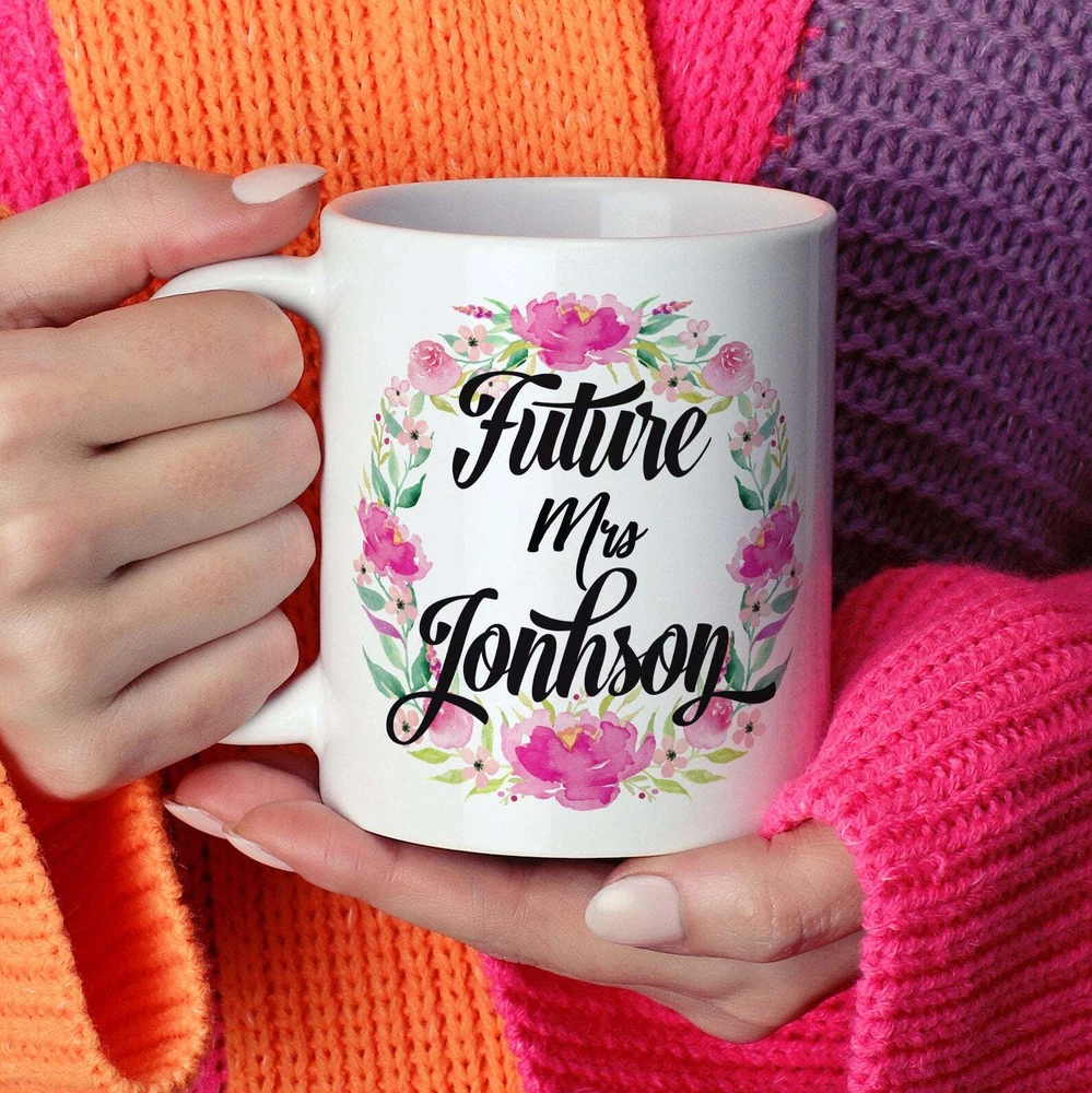Personalized Engagement Mug Future Mrs Mug Engagement Gift Future Mrs Cup Product Details.. This high quality 11oz. ceramic white mug has a premium hard coat that provides crisp and vibrant color reproduction sure to last for years. Perfect for all hot & cold beverages. The highest quality printing possible is used. It will never fade no matter how many times you wash it. Material: 100% Ceramic. Print both sides. Dishwasher and Microwave Safe. High Gloss + Premium White Finish. Printed in the U.S.A. Personalized & Custom. We support personalized and custom mug to add custom, when placing an order, you can add notes to the "order note" in shipping address section. Also you can contact us directly via message. Shipping Info. Ready to ship in 1 to 2 business days, All products are made-to-order and proudly printed in the United States. Shipped by USPS and DHL, You will receive your order in 5-7 days. Replace & Refund. All products are defective during shipping broken, chipped will be replaced free of charge. You are not satisfied with the product, we will refund 100% money to you. If any other issues arise, please do not hesitate to message, we would be more than happy to assist you.