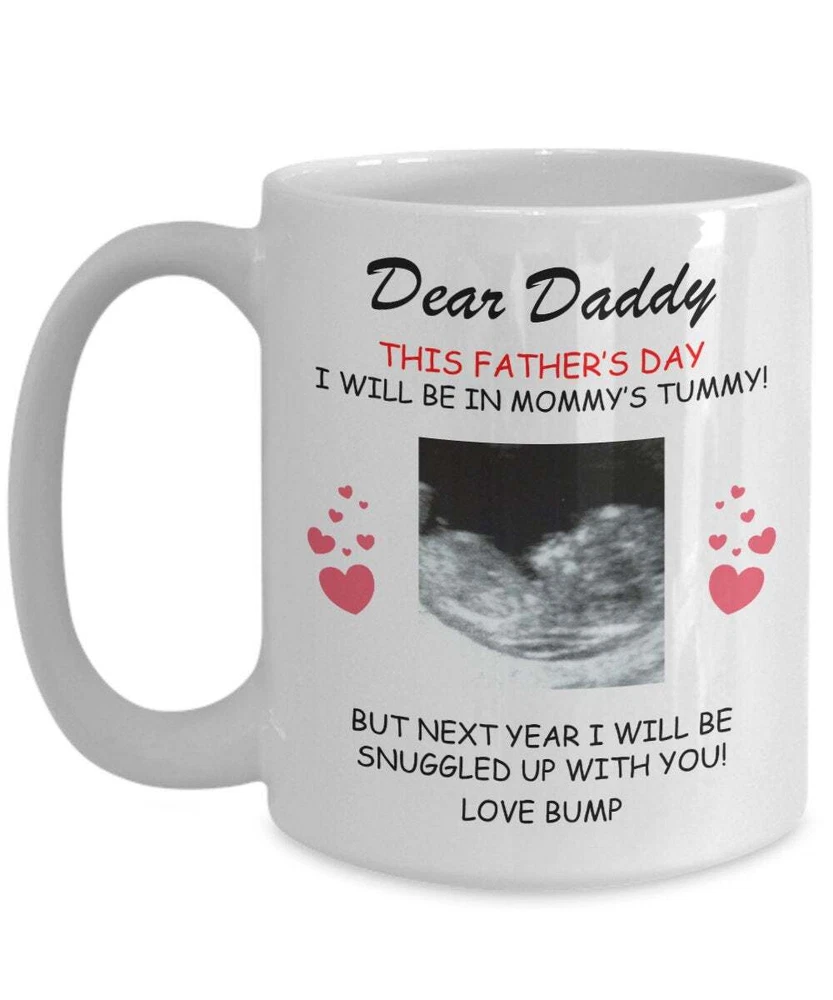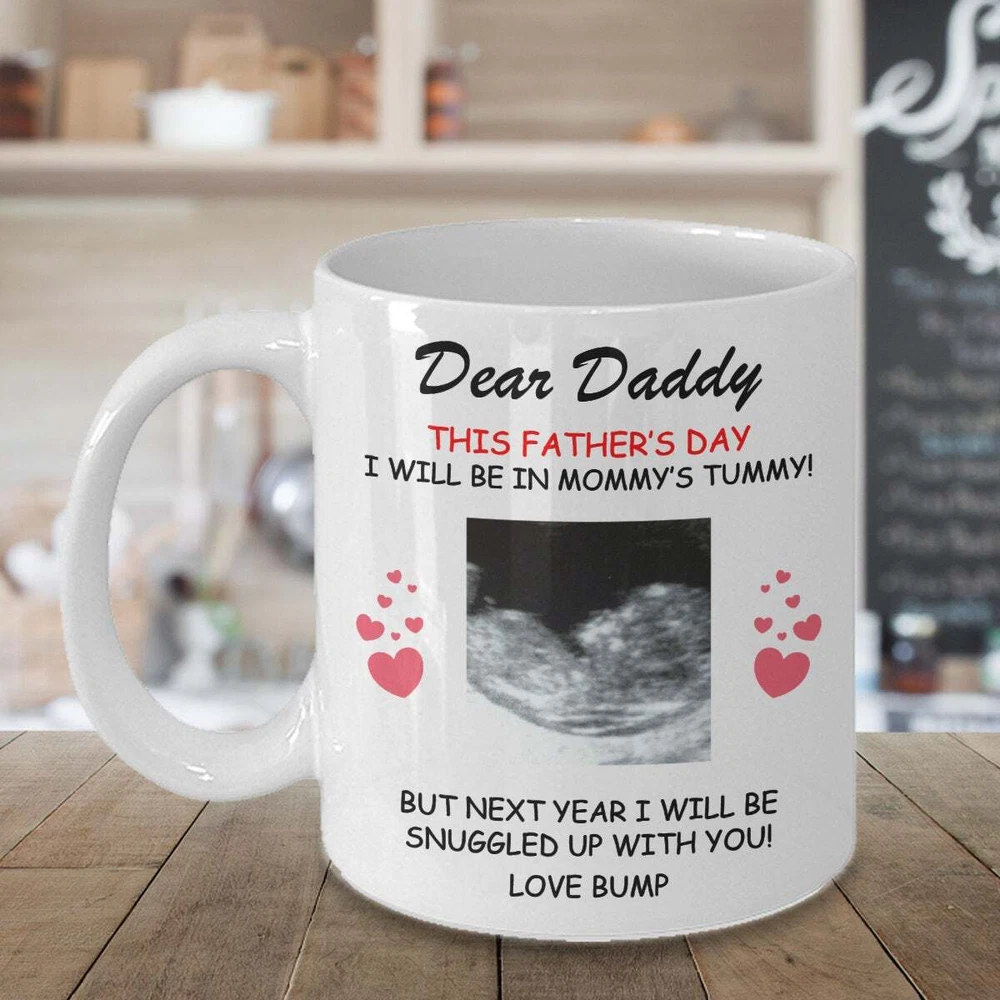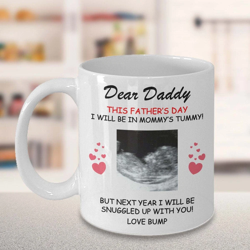 Personalized Fathers Day Gift From Bump Mommy's Tummy Custom Gift For Daddy Best Product Details.. This high quality 11oz. ceramic white mug has a premium hard coat that provides crisp and vibrant color reproduction sure to last for years. Perfect for all hot & cold beverages. The highest quality printing possible is used. It will never fade no matter how many times you wash it. Material: 100% Ceramic. Print both sides. Dishwasher and Microwave Safe. High Gloss + Premium White Finish. Printed in the U.S.A. Personalized & Custom. We support personalized and custom mug to add custom, when placing an order, you can add notes to the "order note" in shipping address section. Also you can contact us directly via message. Shipping Info. Ready to ship in 1 to 2 business days, All products are made-to-order and proudly printed in the United States. Shipped by USPS and DHL, You will receive your order in 5-7 days. Replace & Refund. All products are defective during shipping broken, chipped will be replaced free of charge. You are not satisfied with the product, we will refund 100% money to you. If any other issues arise, please do not hesitate to message, we would be more than happy to assist you.