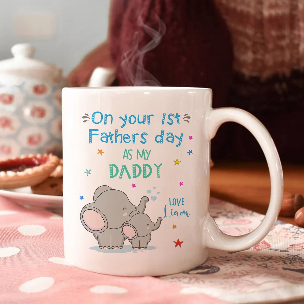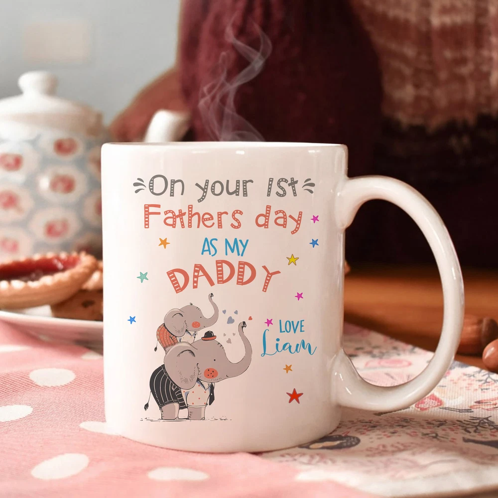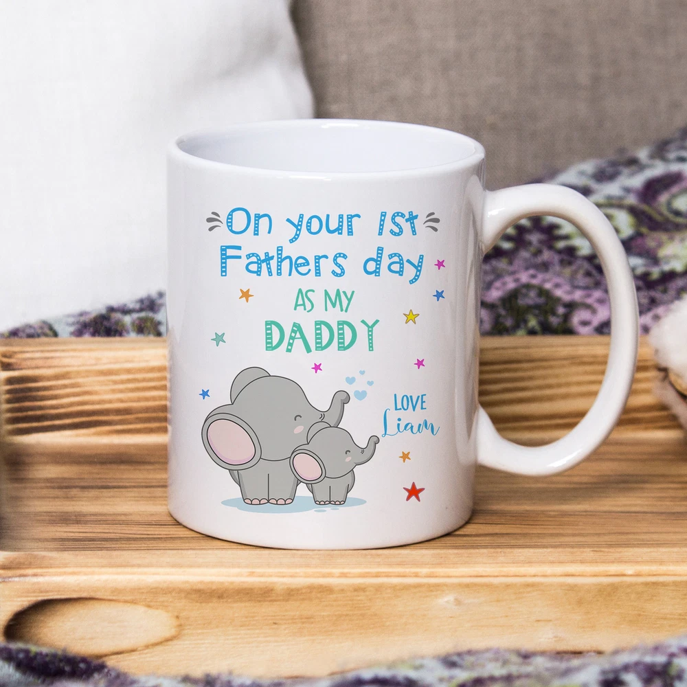 Personalized First Fathers Day Dad Baby Elephant Gift Baby Shower Gift Dad Mug Product Details.. This high quality 11oz. ceramic white mug has a premium hard coat that provides crisp and vibrant color reproduction sure to last for years. Perfect for all hot & cold beverages. The highest quality printing possible is used. It will never fade no matter how many times you wash it. Material: 100% Ceramic. Print both sides. Dishwasher and Microwave Safe. High Gloss + Premium White Finish. Printed in the U.S.A. Personalized & Custom. We support personalized and custom mug to add custom, when placing an order, you can add notes to the "order note" in shipping address section. Also you can contact us directly via message. Shipping Info. Ready to ship in 1 to 2 business days, All products are made-to-order and proudly printed in the United States. Shipped by USPS and DHL, You will receive your order in 5-7 days. Replace & Refund. All products are defective during shipping broken, chipped will be replaced free of charge. You are not satisfied with the product, we will refund 100% money to you. If any other issues arise, please do not hesitate to message, we would be more than happy to assist you.