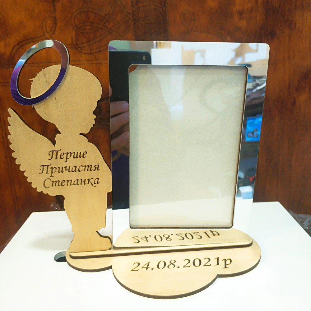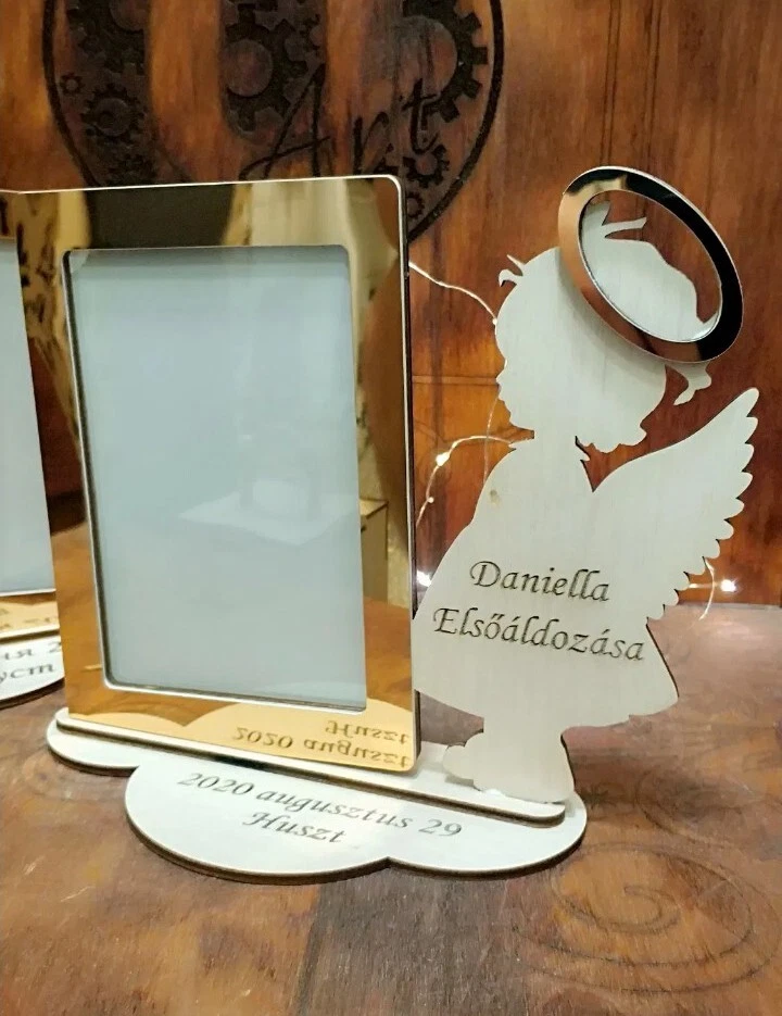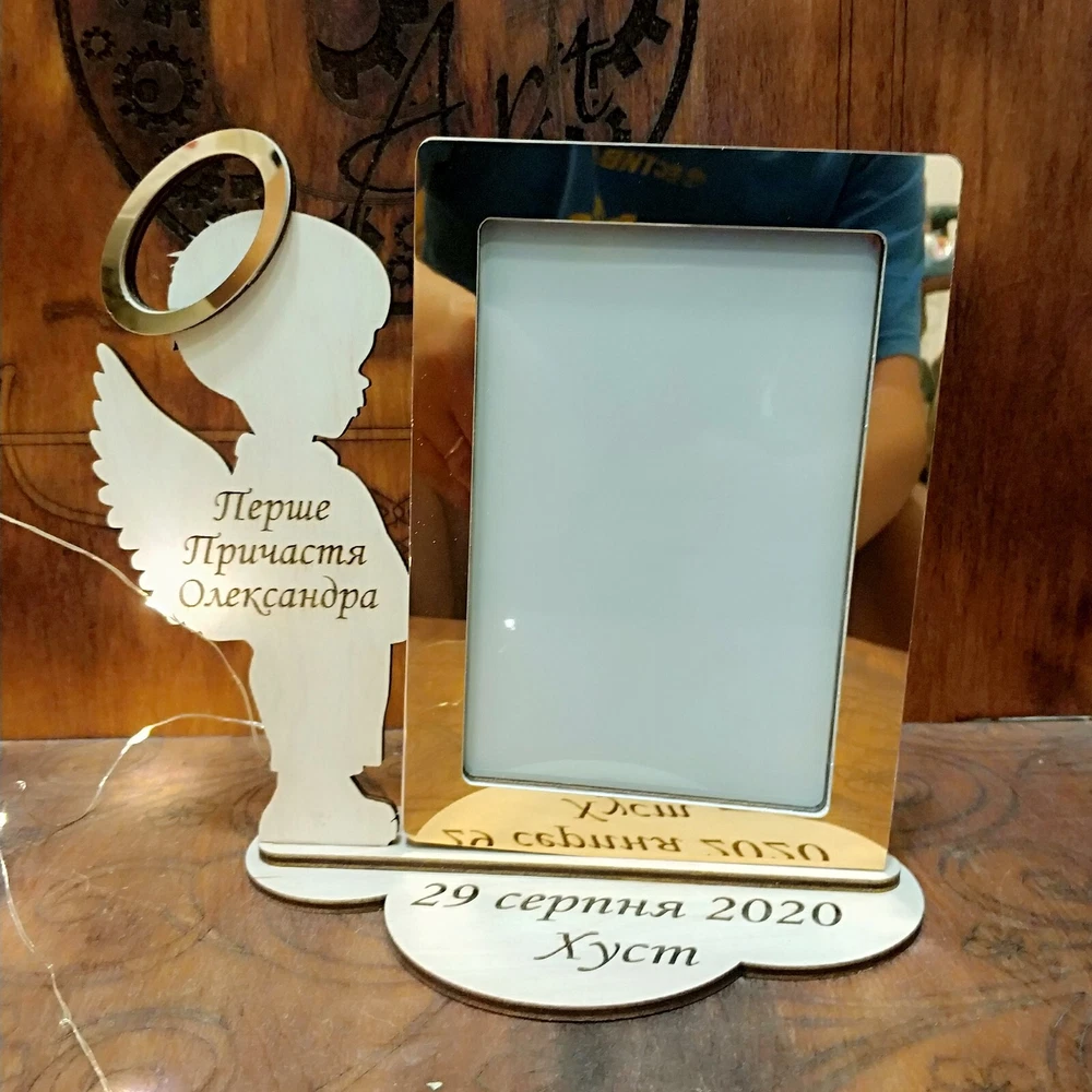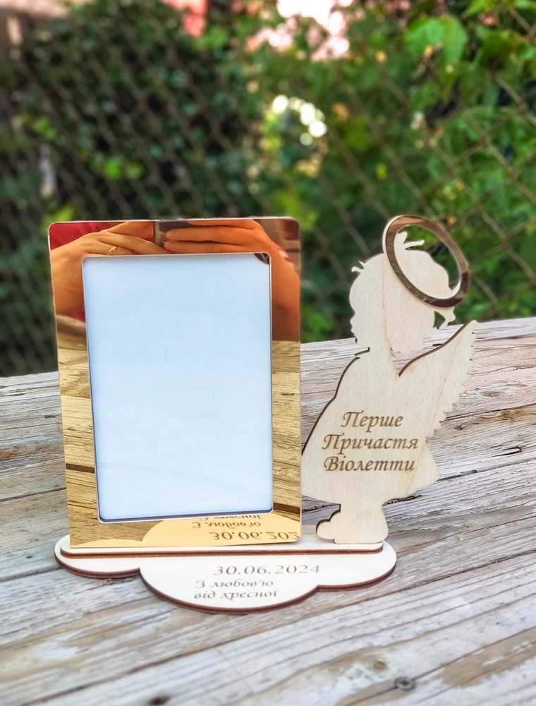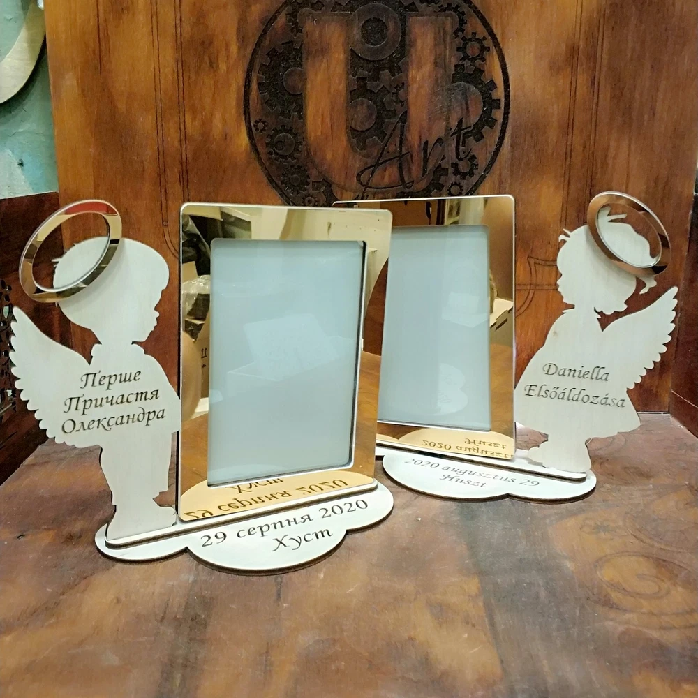 Cute wooden first communion photo frame for a boy or girl. Under the photo 4x6 ? (10x15cm). The frame and halo can be made golden or silver. Material: plywood 4mm, back cover fiberboard 3mm, polystyrene 1mm. At your request I apply laser engraving of the name, date and place of First HolyCommunion. Thank you for stopping by, have a good shopping!