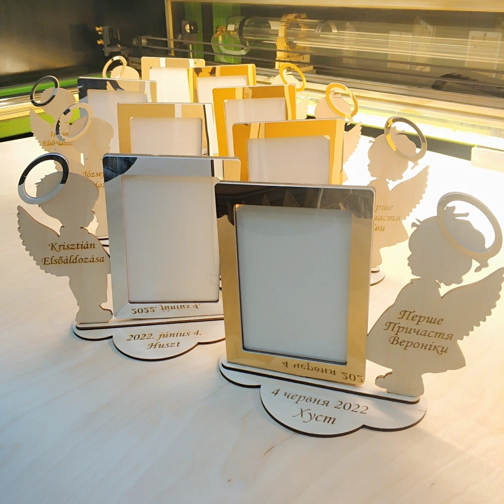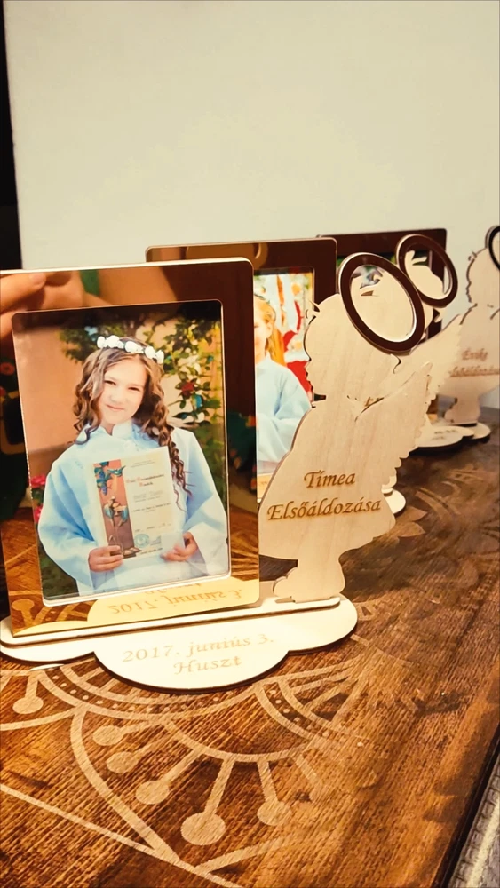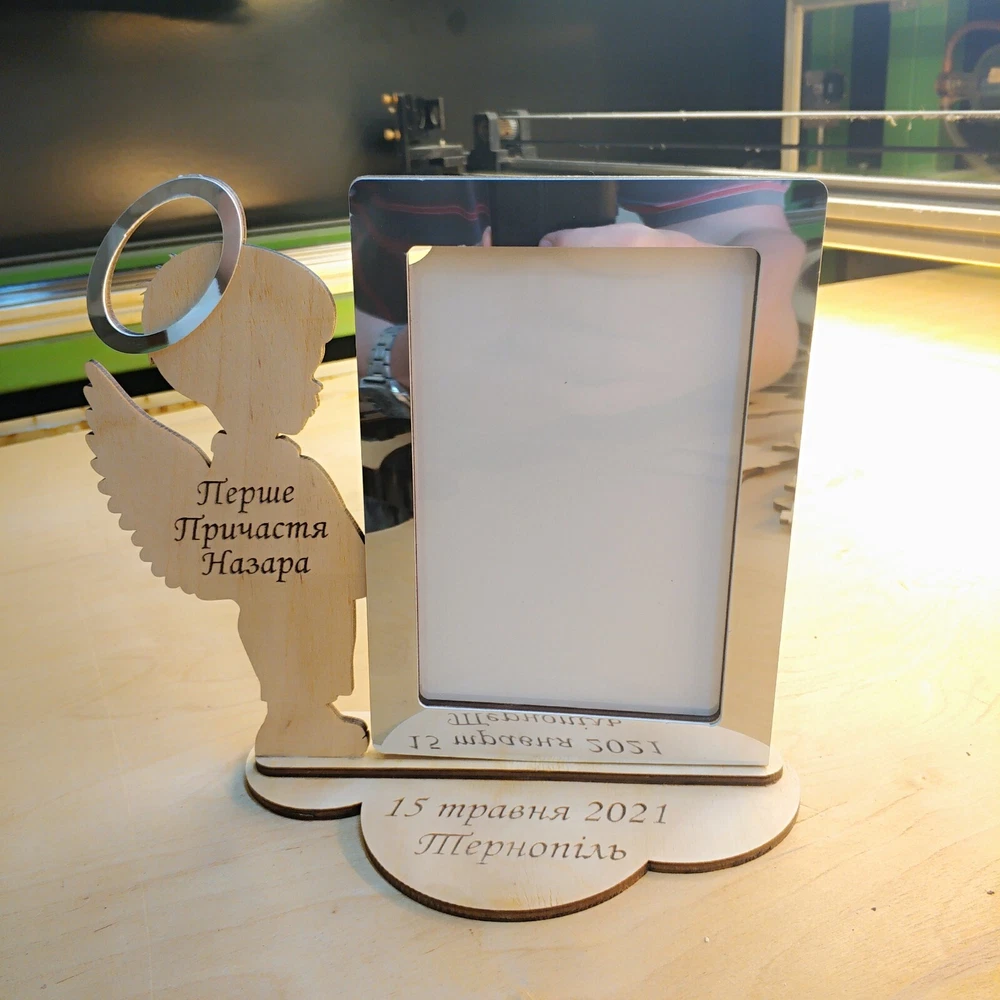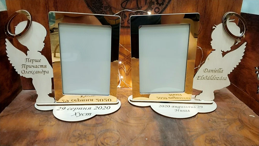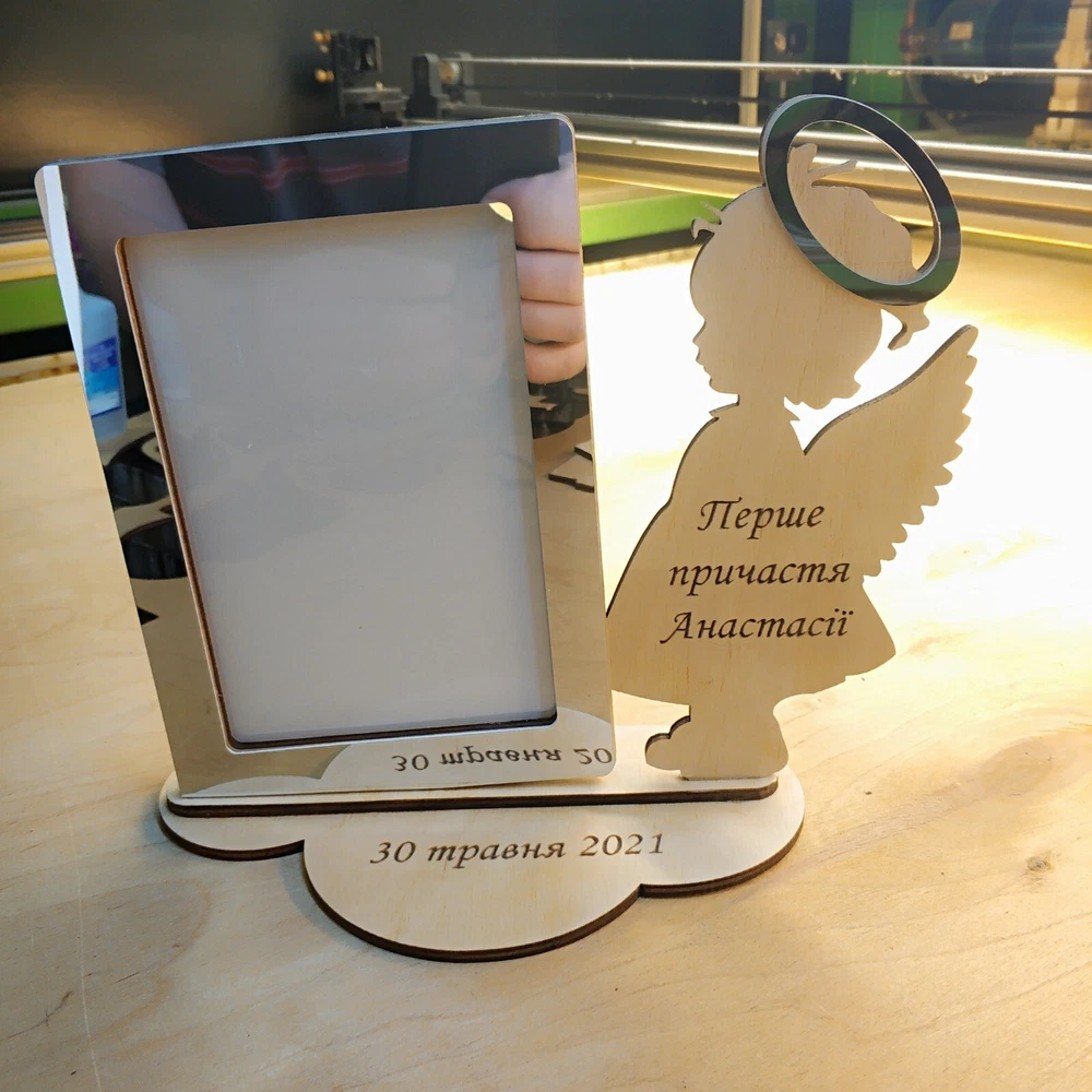 Cute wooden first communion photo frame for a boy or girl. Under the photo 4x6 ? (10x15cm). The frame and halo can be made golden or silver. Material: plywood 4mm, back cover fiberboard 3mm, polystyrene 1mm. At your request I apply laser engraving of the name, date and place of First HolyCommunion. Thank you for stopping by, have a good shopping!