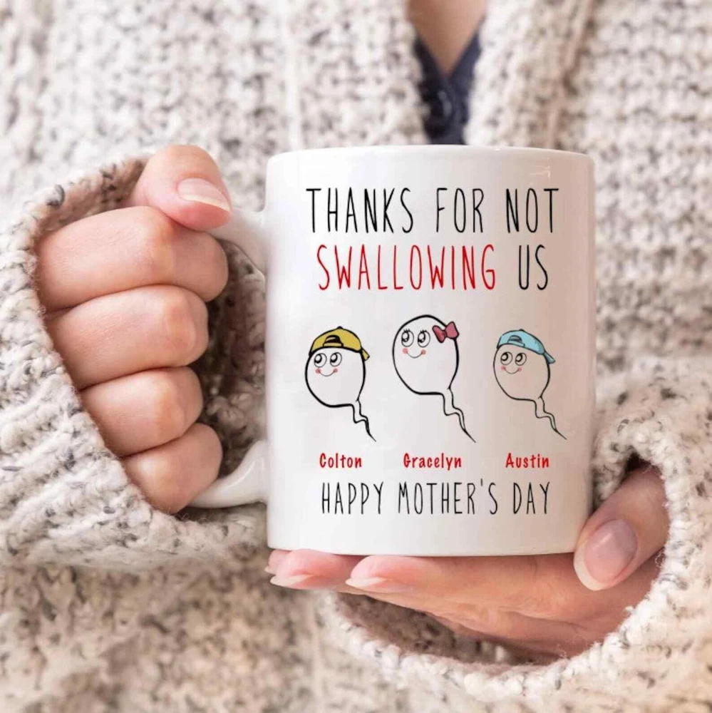 Personalized Funny Thanks For Not Swallowing Us Mug Custom Kid Name Mug Funny Mom Mug Mothers Day Gift Gift For Mom Birthday Mama Gift Product Details.. This high quality 11oz. ceramic white mug has a premium hard coat that provides crisp and vibrant color reproduction sure to last for years. Perfect for all hot & cold beverages. The highest quality printing possible is used. It will never fade no matter how many times you wash it. Material: 100% Ceramic. Print both sides. Dishwasher and Microwave Safe. High Gloss + Premium White Finish. Printed in the U.S.A. Personalized & Custom. We support personalized and custom mug to add custom, when placing an order, you can add notes to the "order note" in shipping address section. Also you can contact us directly via message. Shipping Info. Ready to ship in 1 to 2 business days, All products are made-to-order and proudly printed in the United States. Shipped by USPS and DHL, You will receive your order in 5-7 days. Replace & Refund. All products are defective during shipping broken, chipped will be replaced free of charge. You are not satisfied with the product, we will refund 100% money to you. If any other issues arise, please do not hesitate to message, we would be more than happy to assist you.