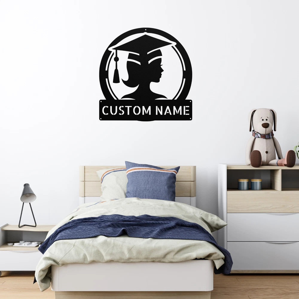Product Description Personalized Girl Grad Cap Metal Sign Custom Graduation Decor Unique Gift Idea Celebrate a special achievement with the Personalized Girl Grad Cap Metal Sign ! This delightful sign is the perfect way to honor a graduate and add a personal touch to any space. Made from 16 gauge high-quality metal , this sign is designed for durability. The powder coating ensures it is dust, weather, and water-resistant, making it suitable for both indoor and outdoor display. Key features include: Customizable Design: Personalize it with the graduate’s name and graduation year. Sturdy and Long-Lasting: Crafted from high-quality metal for enduring use. Perfect Gift: An ideal choice for graduations, birthdays, or any special occasion. Stylish Decor: Great for home, office, or dorm room decoration. Show your pride and create a lasting memory with the Personalized Girl Grad Cap Metal Sign . It’s not just a sign; it’s a cherished keepsake that celebrates success! Service and Color Choice Our metal signs are designed to be personalized just for you, making them the perfect addition to any space! The default color for our signs is Black , but we also offer a variety of beautiful options including Copper, Gold, White, and Silver . After placing your order, simply contact us with your preferred color choice, and we'll ensure your sign is exactly how you envision it. Let’s create something special together!