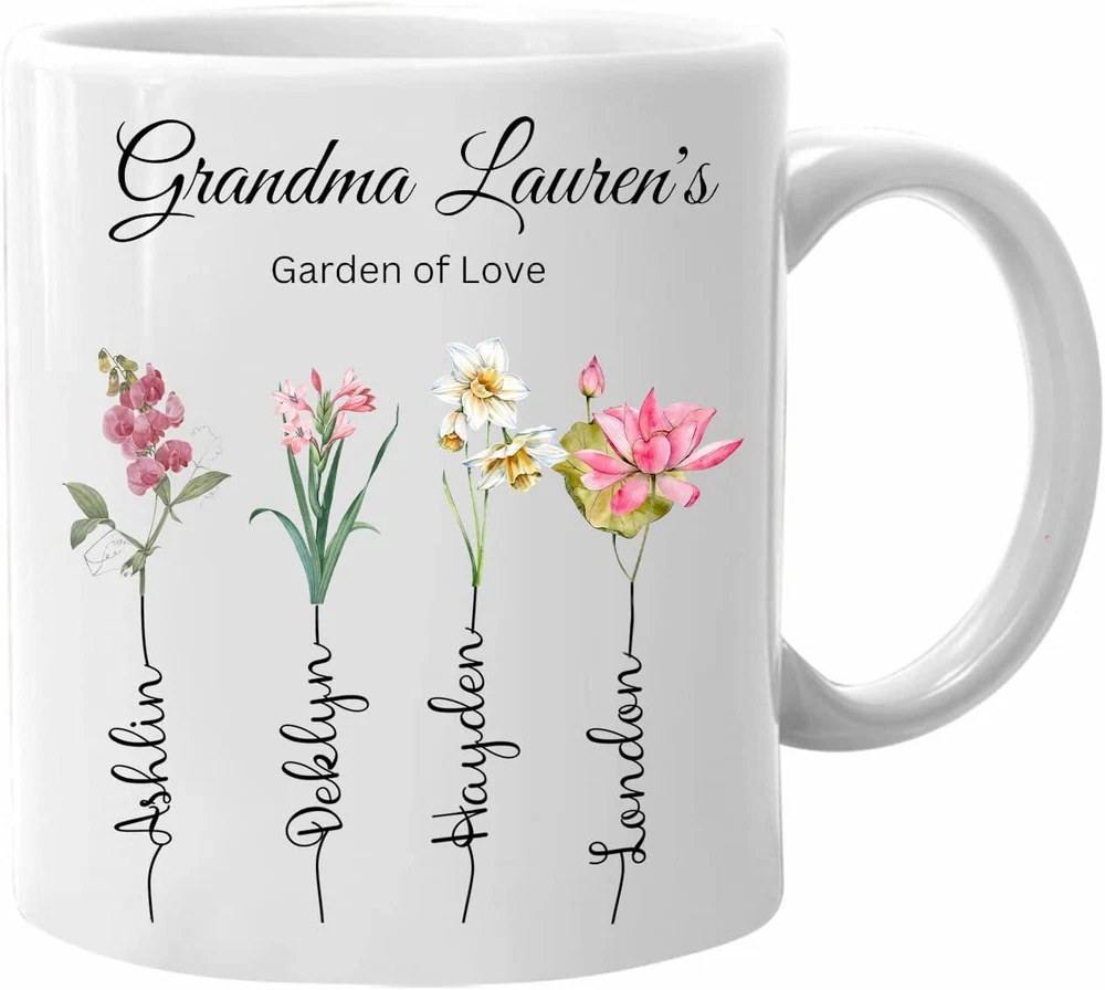 Personalized Grandmas Garden Of Love Flower Mug Custom Kid Names Coffee Cups Gifts Grandma Mom From Kids Mug Gifts For Mothers Day (Multi 1) Product Details.. This high quality 11oz. ceramic white mug has a premium hard coat that provides crisp and vibrant color reproduction sure to last for years. Perfect for all hot & cold beverages. The highest quality printing possible is used. It will never fade no matter how many times you wash it. Material: 100% Ceramic. Print both sides. Dishwasher and Microwave Safe. High Gloss + Premium White Finish. Printed in the U.S.A. Personalized & Custom. We support personalized and custom mug to add custom, when placing an order, you can add notes to the "order note" in shipping address section. Also you can contact us directly via message. Shipping Info. Ready to ship in 1 to 2 business days, All products are made-to-order and proudly printed in the United States. Shipped by USPS and DHL, You will receive your order in 5-7 days. Replace & Refund. All products are defective during shipping broken, chipped will be replaced free of charge. You are not satisfied with the product, we will refund 100% money to you. If any other issues arise, please do not hesitate to message, we would be more than happy to assist you.