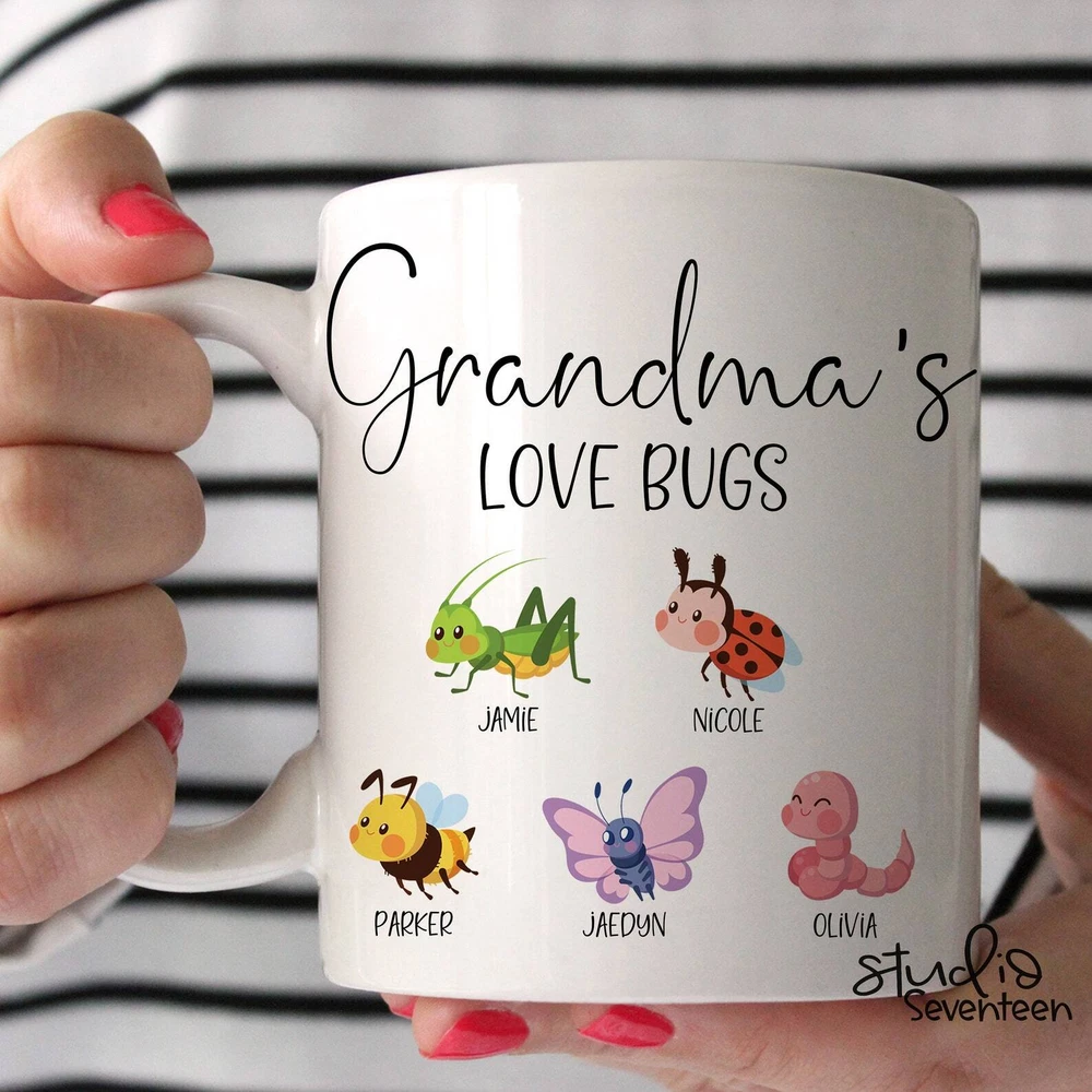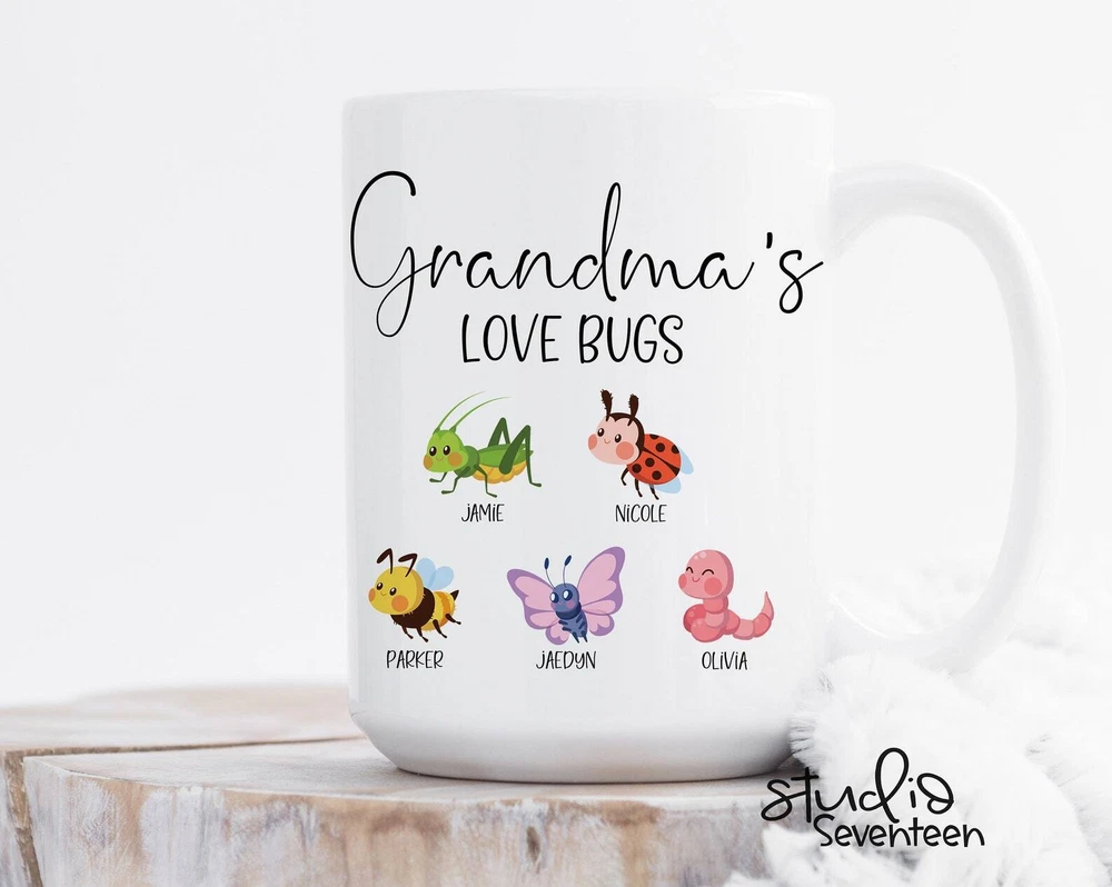 Personalized Grandma's Love Bugs Mug New Grandmother Gift Custom Birthday Gift Product Details.. This high quality 11oz. ceramic white mug has a premium hard coat that provides crisp and vibrant color reproduction sure to last for years. Perfect for all hot & cold beverages. The highest quality printing possible is used. It will never fade no matter how many times you wash it. Material: 100% Ceramic. Print both sides. Dishwasher and Microwave Safe. High Gloss + Premium White Finish. Printed in the U.S.A. Personalized & Custom. We support personalized and custom mug to add custom, when placing an order, you can add notes to the "order note" in shipping address section. Also you can contact us directly via message. Shipping Info. Ready to ship in 1 to 2 business days, All products are made-to-order and proudly printed in the United States. Shipped by USPS and DHL, You will receive your order in 5-7 days. Replace & Refund. All products are defective during shipping broken, chipped will be replaced free of charge. You are not satisfied with the product, we will refund 100% money to you. If any other issues arise, please do not hesitate to message, we would be more than happy to assist you.