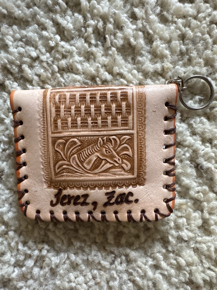 Beautiful handmade leather coin pouch/keychain with personalized name “Karen” and detailed embossed artwork. Originates from Jerez, Zacatecas, Mexico. Perfect for collectors or as a unique gift.