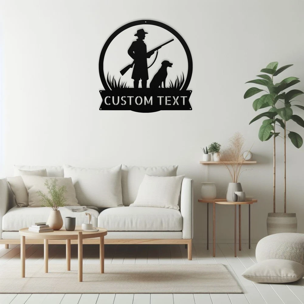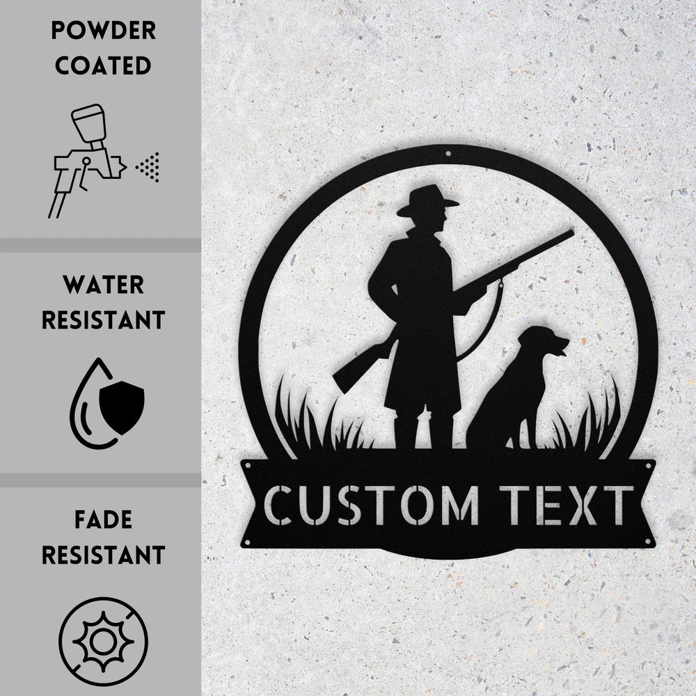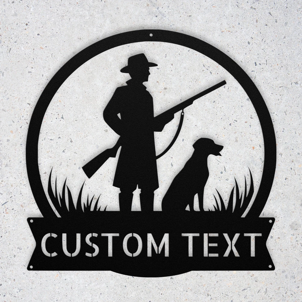 Product Description Personalized Hunter Dog Metal Sign Custom Wall Art Decor Gift for Outdoorsmen Showcase your love for the great outdoors with our Personalized Hunter and Dog Metal Sign ! This custom wall art decor is perfect for outdoorsmen, adding a unique touch to your home, cabin, or office. Made from high-quality 16-gauge metal, this sign is designed with a durable powder coating that protects it from dust, weather, and water, making it suitable for both indoor and outdoor use. Looking for a thoughtful gift? This personalized metal sign makes a fantastic choice for Christmas, birthdays, or any special occasion. It’s a wonderful way to celebrate the bond between hunters and their loyal companions. Key Features: Customizable Design : Personalize the sign with your name or a special message. Durable Material : Crafted from 16-gauge high-quality metal for lasting beauty. Weather-Resistant : Powder-coated finish ensures protection against dust, rain, and rust. Versatile Decor : Ideal for both indoor and outdoor display. Great Gift Idea : A unique present for any hunting enthusiast or dog lover. Celebrate your passion for hunting or surprise a friend with this striking metal sign. Order yours today and add a personal touch to your decor! Service and Color Choice Our metal signs are designed to be personalized just for you, making them the perfect addition to any space! The default color for our signs is Black , but we also offer a variety of beautiful options including Copper, Gold, White, and Silver . After placing your order, simply contact us with your preferred color choice, and we'll ensure your sign is exactly how you envision it. Let’s create something special together!