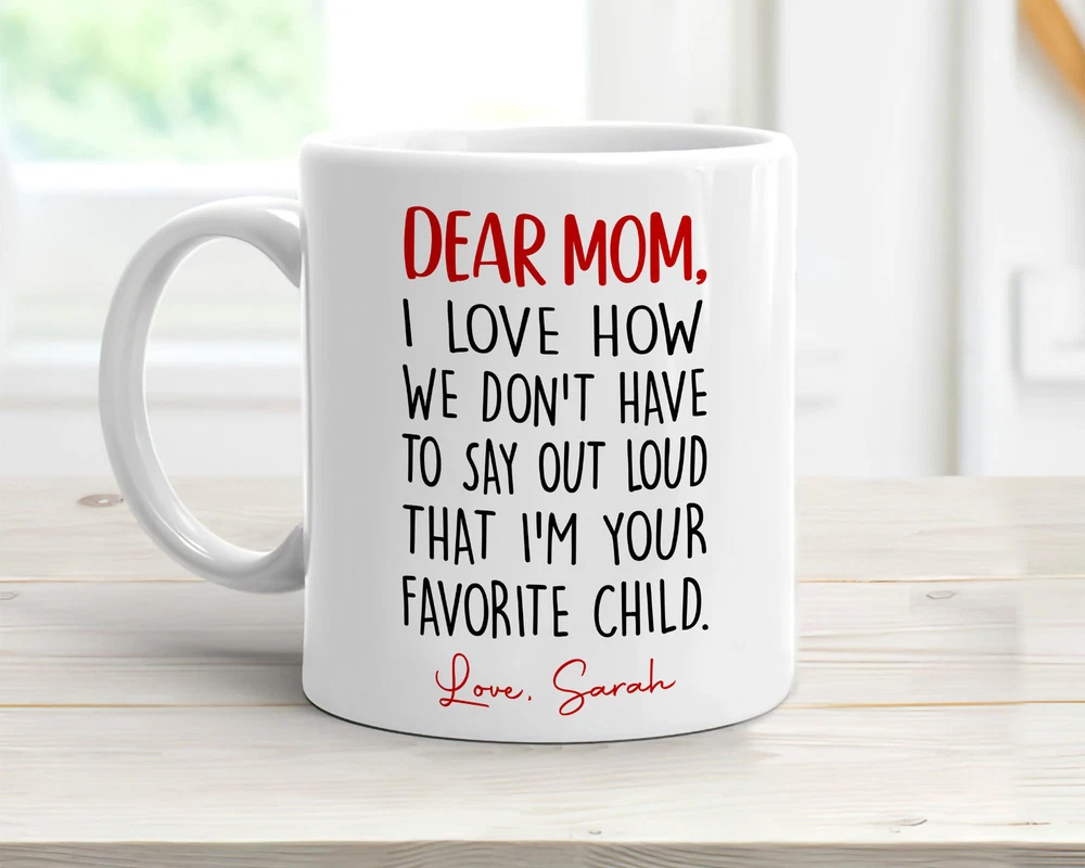Personalized Mom I'm Your Favorite Child Mug Mom Birthday Gift Mug Custom Mom Product Details.. This high quality 11oz. ceramic white mug has a premium hard coat that provides crisp and vibrant color reproduction sure to last for years. Perfect for all hot & cold beverages. The highest quality printing possible is used. It will never fade no matter how many times you wash it. Material: 100% Ceramic. Print both sides. Dishwasher and Microwave Safe. High Gloss + Premium White Finish. Printed in the U.S.A. Personalized & Custom. We support personalized and custom mug to add custom, when placing an order, you can add notes to the "order note" in shipping address section. Also you can contact us directly via message. Shipping Info. Ready to ship in 1 to 2 business days, All products are made-to-order and proudly printed in the United States. Shipped by USPS and DHL, You will receive your order in 5-7 days. Replace & Refund. All products are defective during shipping broken, chipped will be replaced free of charge. You are not satisfied with the product, we will refund 100% money to you. If any other issues arise, please do not hesitate to message, we would be more than happy to assist you.