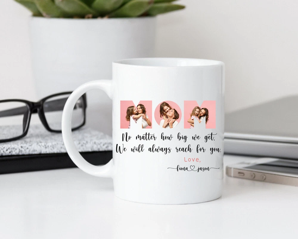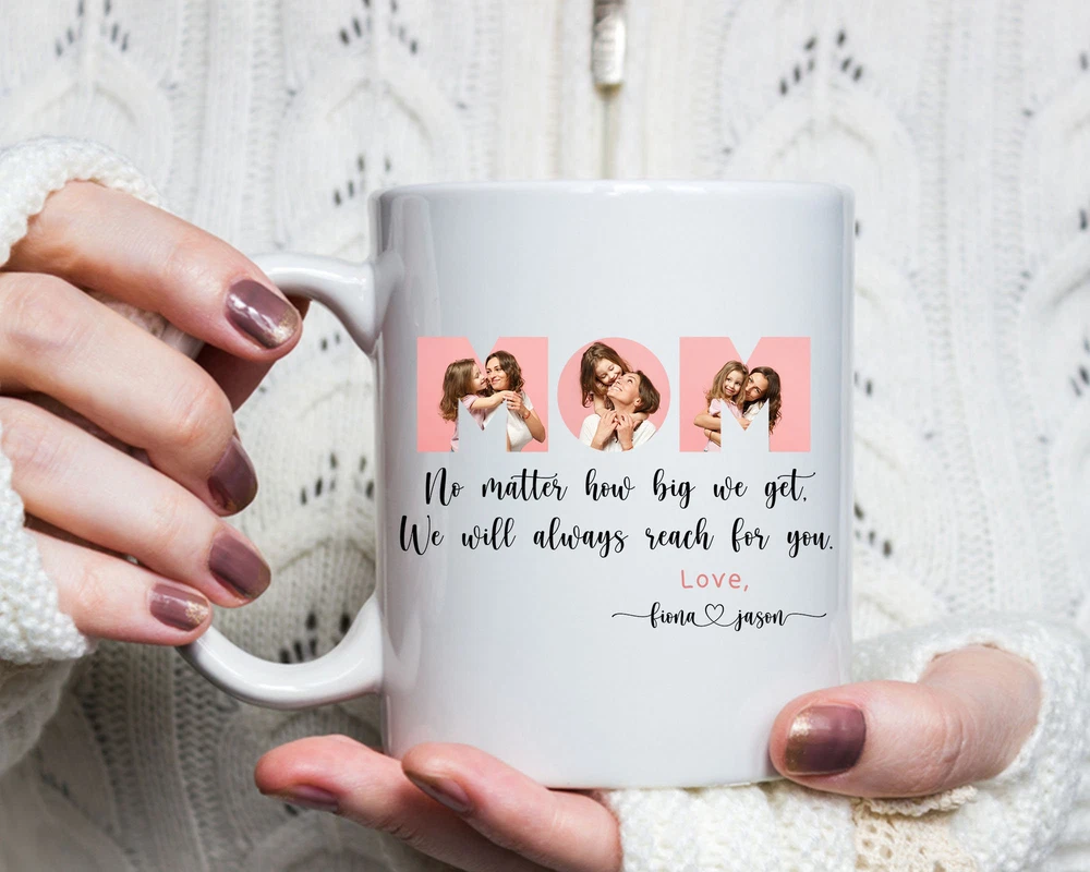 Personalized Mom Mug No Matter How Big We Get Mug Mother's Day Gift Idea Mug For Product Details.. This high quality 11oz. ceramic white mug has a premium hard coat that provides crisp and vibrant color reproduction sure to last for years. Perfect for all hot & cold beverages. The highest quality printing possible is used. It will never fade no matter how many times you wash it. Material: 100% Ceramic. Print both sides. Dishwasher and Microwave Safe. High Gloss + Premium White Finish. Printed in the U.S.A. Personalized & Custom. We support personalized and custom mug to add custom, when placing an order, you can add notes to the "order note" in shipping address section. Also you can contact us directly via message. Shipping Info. Ready to ship in 1 to 2 business days, All products are made-to-order and proudly printed in the United States. Shipped by USPS and DHL, You will receive your order in 5-7 days. Replace & Refund. All products are defective during shipping broken, chipped will be replaced free of charge. You are not satisfied with the product, we will refund 100% money to you. If any other issues arise, please do not hesitate to message, we would be more than happy to assist you.