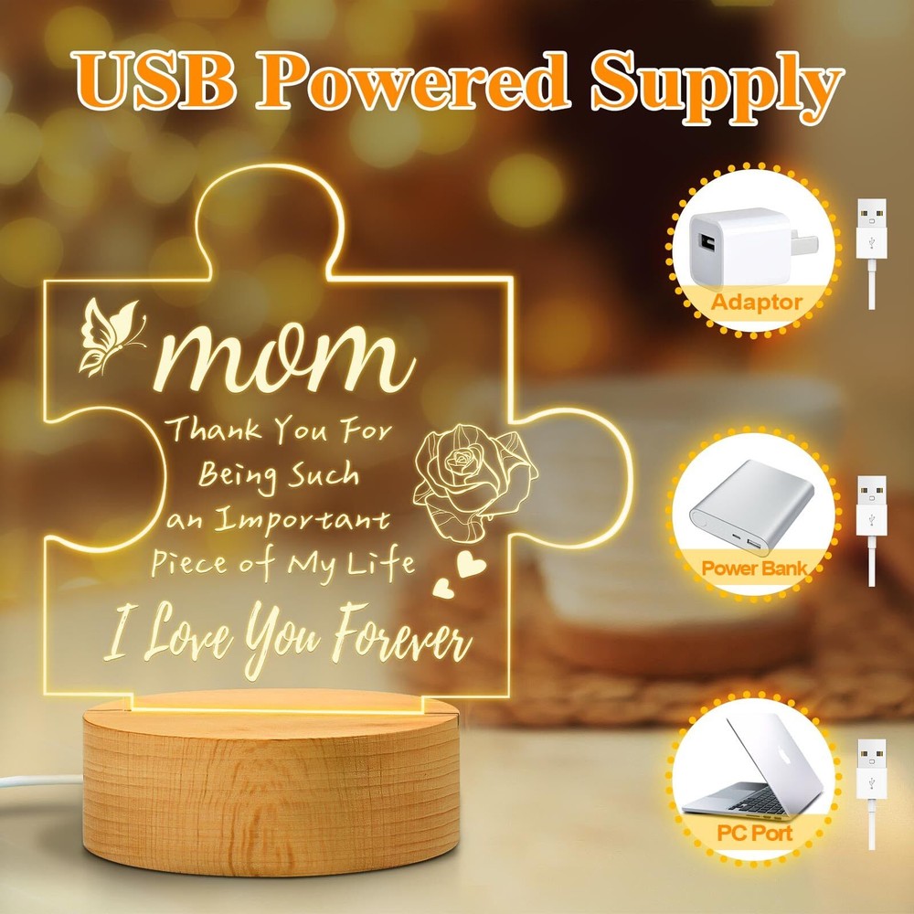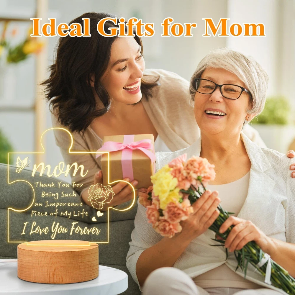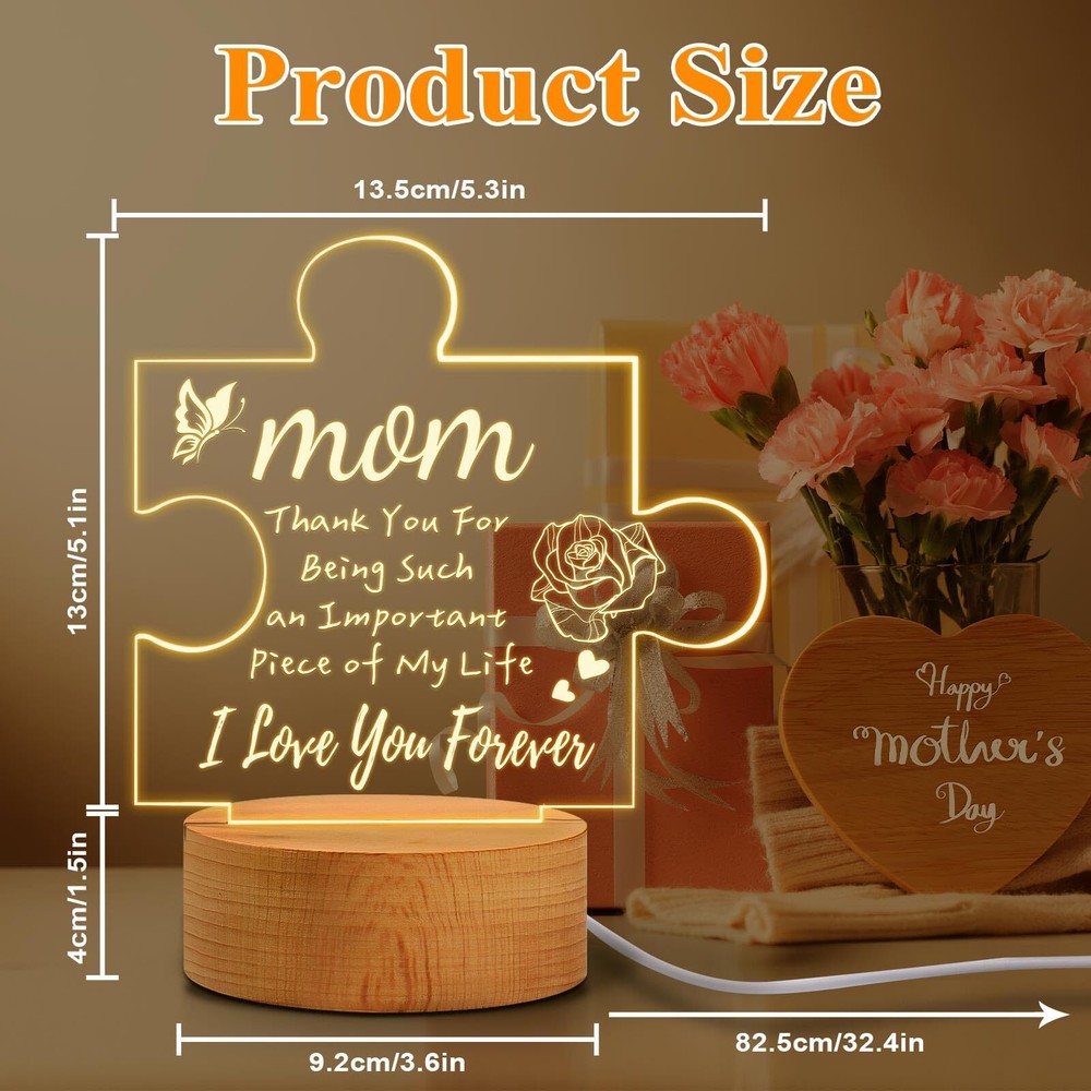 Mothers Day Gifts for Mom from Daughter Son, Engraved Acrylic Night Light Birthday Gifts for Mom, Christmas Presents Thanksgiving Gifts for Mom, Wooden Base PRODUCT DESCRIPTION PRODUCT FEATURES 💝【Gifts for Mom】: Choose the most unique engraved acrylic night light gifts for mom on christmas, mothers Day or birthday. 🎀 【Gifts for Mom from Daughter Son】: This engraved acrylic night light is a great mother's day gifts from daughter son is not only has warm light and words, but it is also a beautiful home decor for the living room, bedroom, baby room, etc. The gentle light will protect the eyes. Even if mom wakes up in the middle night, it will not disturb her sleep at night, creating the ideal sleep environment for your mom. 💕【Mom Gifts Apply for Occasions】: A perfect mother gift with this unique acrylic night light lamp. Create a surprise for moms on mothers Day gifts, birthday gifts, Thanksgiving gifts, Christmas gifts, Anniversary gifts, Valentine's Day gifts, etc. These lovely mom night light gifts will make mom smile and feel warm in her heart. Just push the switch button, and the engraved night light will keep company with her all night, just you're always by her side. 💟【Acrylic Night Light Birthday Gifts for Mom】: This engraved acrylic night light mom gifts is made of high-quality acrylic and wooden base. The engraved words on the plate are clear and do not easily fade. The light is bright. The wooden base is also not easy to break. It is powered by a USB cable, just need to plug it into a PC, mobile power device, etc. Very easy and safe to use. 💟【Unique Mom Gifts Product Support】: Mothers Day Gifts engraved acrylic night light for mom Perfect size for the table home decor. The engraved acrylic night light birthday Mother's Day gifts will be packaged in an exquisite box. If you have any questions about this mom gifts night light, please feel free to contact us. 🚚 SHIPPING We offer fast and reliable shipping. Your order will be processed within 1-2 business days. International shipping is available to most countries. All items are securely packaged to ensure safe delivery. 🔄 RETURNS If you are not satisfied with your purchase, you can return it within 30 days for a full refund. Refunds will be processed to your original method of payment. Items must be returned in their original condition and packaging. 💳 PAYMENT We accept payment via PayPal, credit cards, and other payment methods supported by eBay. Please ensure your payment method is correct and updated to avoid any delays in processing your order. ⭐ FEEDBACK We value your feedback. If you are happy with your purchase, please leave us a positive review. 📞 CONTACT US If you have any questions or need further assistance, please feel free to contact us through eBay messages.