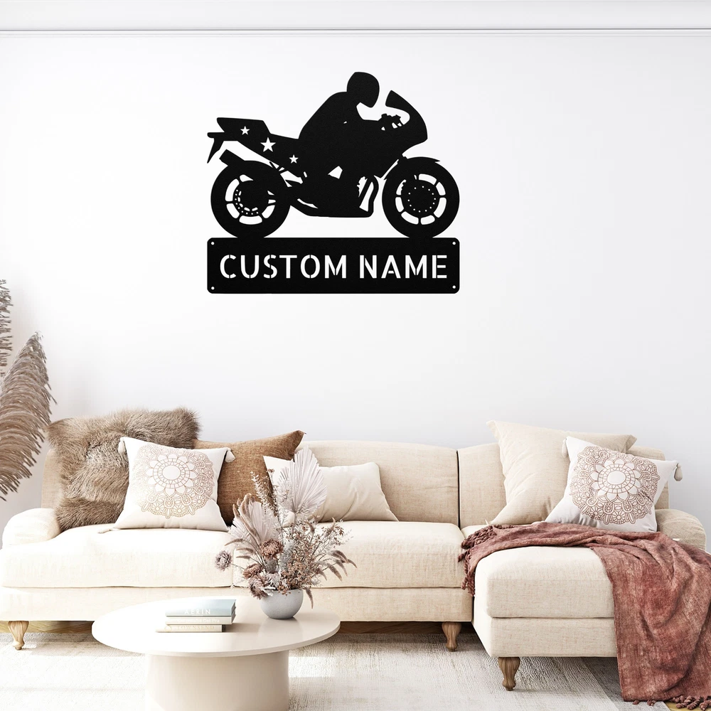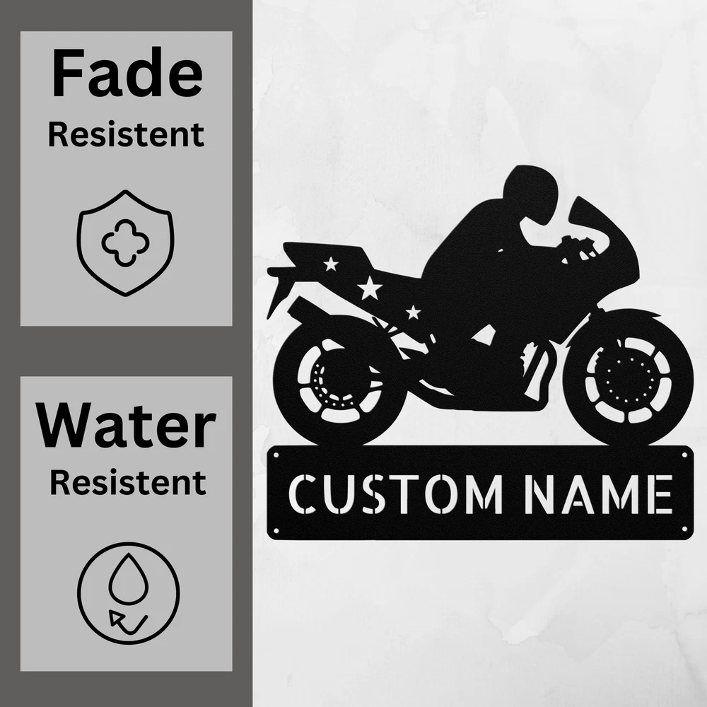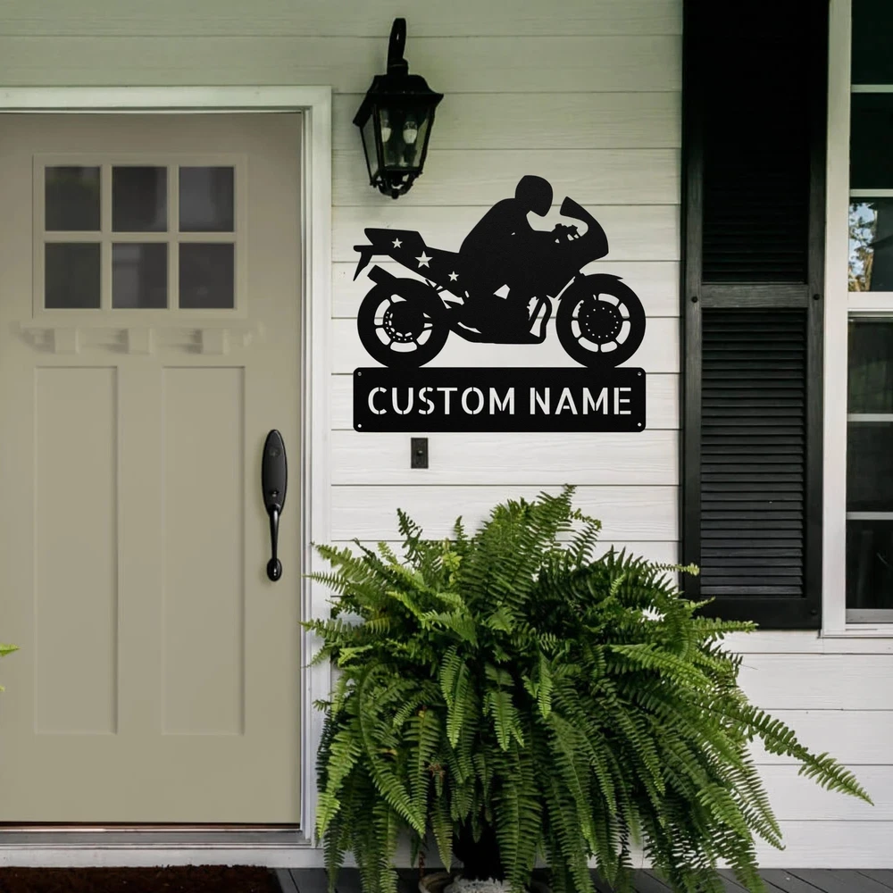 Product Description Personalized Motorcycle Metal Sign Custom Biker Decor Gift for Motorcycle Lovers Rev up your decor with our Personalized Motorcycle Metal Sign ! This eye-catching sign is perfect for motorcycle enthusiasts and adds a personal touch to any space. Made from 16 gauge high-quality metal , this sign is designed for durability. The powder coating ensures it is dust, weather, and water resistant, making it suitable for both indoor and outdoor use. Key features include: Customizable Design: Personalize your sign with a name or special message for a unique touch. Durable Construction: Crafted from sturdy metal to withstand the elements and daily wear. Perfect Gift: An ideal present for Christmas, birthdays, or any special occasion for the biker in your life. Versatile Decor: Great for your home, garage, or office, adding character and style to any setting. Make a statement with the Personalized Motorcycle Metal Sign . Order yours today and celebrate your passion for riding! Service and Color Choice Our metal signs are designed to be personalized just for you, making them the perfect addition to any space! The default color for our signs is Black , but we also offer a variety of beautiful options including Copper, Gold, White, and Silver . After placing your order, simply contact us with your preferred color choice, and we'll ensure your sign is exactly how you envision it. Let’s create something special together!