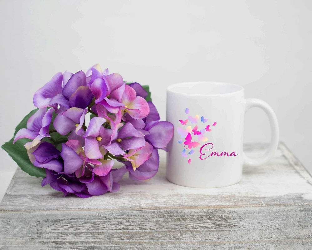 Personalized Mug Butterfly Name Mug Custom Personalized Mug Watercolor Butterfly Product Details.. This high quality 11oz. ceramic white mug has a premium hard coat that provides crisp and vibrant color reproduction sure to last for years. Perfect for all hot & cold beverages. The highest quality printing possible is used. It will never fade no matter how many times you wash it. Material: 100% Ceramic. Print both sides. Dishwasher and Microwave Safe. High Gloss + Premium White Finish. Printed in the U.S.A. Personalized & Custom. We support personalized and custom mug to add custom, when placing an order, you can add notes to the "order note" in shipping address section. Also you can contact us directly via message. Shipping Info. Ready to ship in 1 to 2 business days, All products are made-to-order and proudly printed in the United States. Shipped by USPS and DHL, You will receive your order in 5-7 days. Replace & Refund. All products are defective during shipping broken, chipped will be replaced free of charge. You are not satisfied with the product, we will refund 100% money to you. If any other issues arise, please do not hesitate to message, we would be more than happy to assist you.